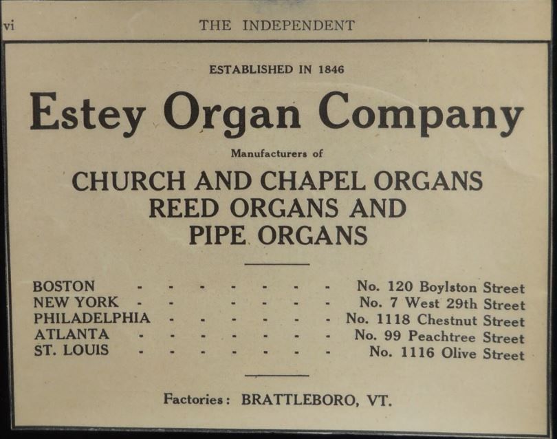 "The Estey Organ Company manufactured excellent reed organs for more than half a century before engaging the Roosevelt-trained Philadelphia builder, William E. Haskell (1865-1927), to open the pipe organ department in 1901. During the next fifty-nine years, the company built and rebuilt 3261 pipe organs. Estey instruments used tubular-pneumatic or electro-pneumatic action. The large Estey factory continued to build reed organs.