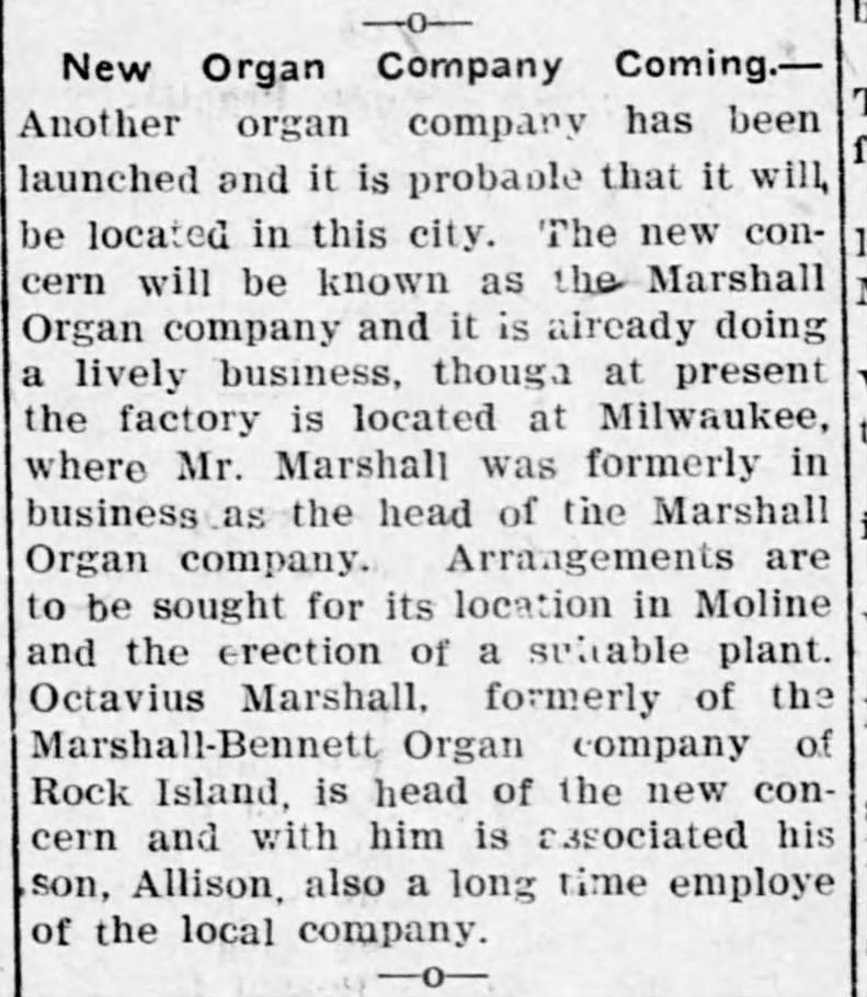 Succeeded Moline Organ Co.; partnership of Octavius Marshall and Robert J. Bennett in Rock Island, Illinois, 1902-1908; succeeded by the Bennett Organ Co.
