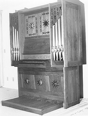 Steve Repasky on May 6th, 2024: Stoplist: Manual I 8' Quintadena; Manual II 8' Rohrflöte; Pedal 8' Gedackt. Manuals share 12 note common bass pipes.