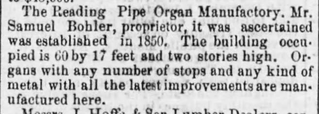 DEATH OF SAMUEL BOHLER, the Well-Known Organ Builder - - Taken ill While at Harrisburg. Samuel Bohler, the well-known organ manufacturer, residing at 109 South Ninth street, Reading, died of cholera morbus at 3 p.m., Saturday, aged 73 years. His death was very sudden and unexpected. He left with several workmen on Monday for Harrisburg, where he superintended the erection of a large organ for the Zion's Lutheran Church. On Tuesday evening he was taken suddenly ill, and was confined to his bed at the Hirsche house. Dr. Gerhart, of that place, was called in and did all in his power to alleviate his sufferings, but of no avail. On Wednesday morning, Mr. Bohler's son-in-law, G.S. Jeffries, was telegraphed for and he immediately went to Harrisburg, where he found that Mr. Bohler's condition was very serious. Mr. Jeffries at once made arrangements to have him removed to Reading, and he was taken there on Wednesday evening. His sufferings at times were intense, and death came very peacefully.