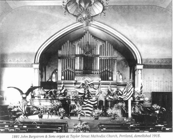 Updated through online information from James R. Stettner. -- The organ has a 3-sectional facade with 29 pipes arranged: 7-15-7. The two side flats are clearly from the Great 8' Open Diapason. The center flat of 15 pipes is "sub-divided" as 7 metal pipes in the center flanked by 4 wooden pipes on either side. These were likely from the Great 16' Bourdon. Behind and above the center section are what appear to be 13 reed resonators. And this could have been from the Great 8' Trumpet. The organ was later relocated to Willamette University and was electrified there. It was later placed in storage at the Catholic Diocesan headquarters. It was ultimately acquired by the Bond firm and the pipes incorporated into a new organ after a fire destroyed their former Kilgen, which had also been rebuilt and enlarged by the Bond firm. The Bergstrom chests were acquired by Meadway & Stettner Pipe Organs of Monroe, Washington and are still extant in storage as of 2/17/07.