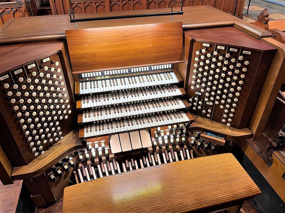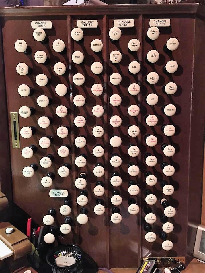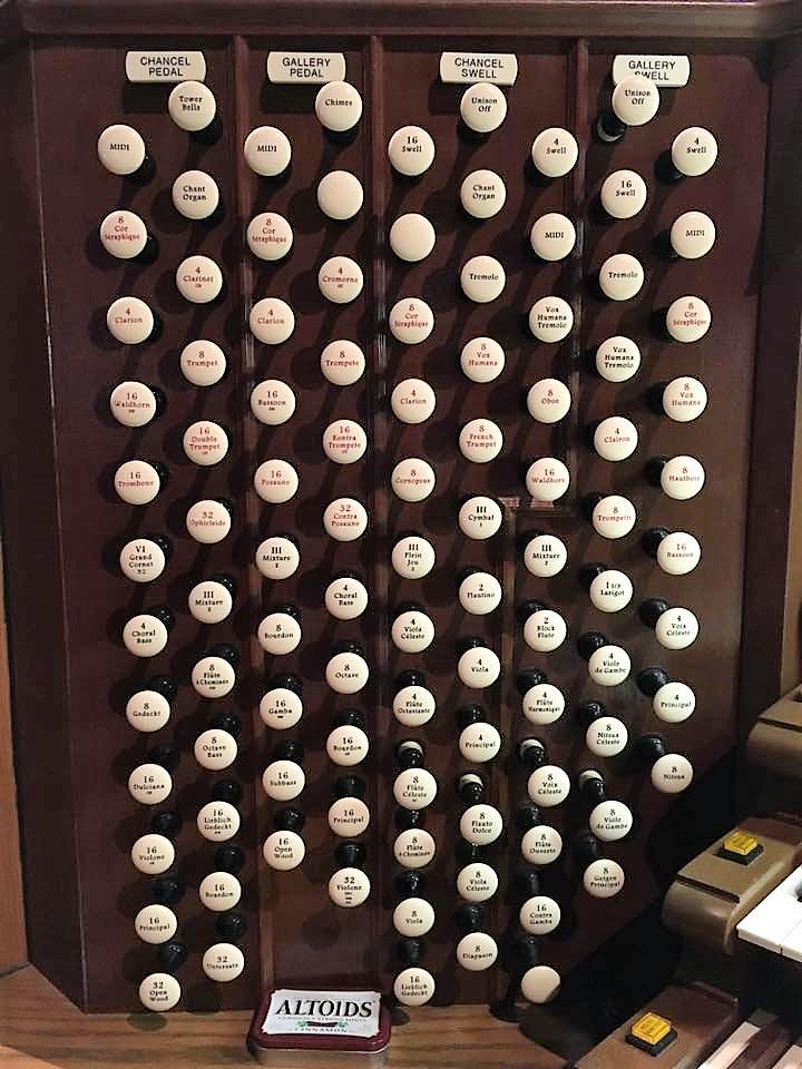Updated through online information from Thom Thomas. -- There are six divisions in the Chancel (Sw., Gt., Ch., Solo, Chant., and Ped.) and three in the Gallery (Sw., Gt.,and Ped.)