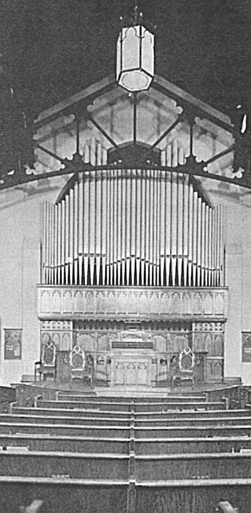 For the new church, the congregation returned to the Hook firm, known then of course as Hook & Hastings, to rebuild, enlarge, and install the organ from the old church as its opus 1980. The electric-action organ had stopknob control. Manual compass was fifty-eight notes (CC-a3); pedal (flat pedalboard) compass was twenty-seven notes (CC-d'). Initially the organ had a water motor.