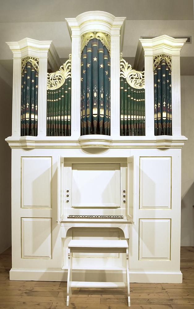 Gold stencilled signature on front of 1884 nameboard (same text handwritten on back of nameboard): *Built 1808, by Christ Dieffenbach, Berks Co., Pa.* / [within unfurling banner] *Rebuilt 1884, by Thos Dieffenbach Millersburg, Pa*. Single manual, tracker action, C-d3 (51 keys). Six original stops; three stops and pedalboard added by Thomas Dieffenbach in 1884. Polychromed case pipes painted by Thomas Dieffenbach's nephew, Jacob Dieffenbach. Built for Zion Lutheran and Reformed Church near Orwigsburg, Pennsyvania. Dedicated October 16, 1808.
