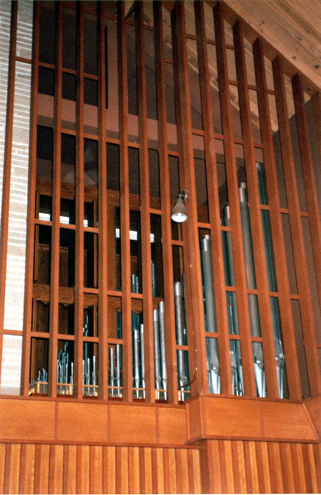 Identified through online information from James R. Stettner. -- 1,919 pipes. The organ is installed on the front wall, but divided on either side of center. A large wooden lattice grille somewhat hides the exposed pipes of the Great and Pedal. The Great is on the right with the Swell behind it. And the Pedal is on the left with the Choir behind it.