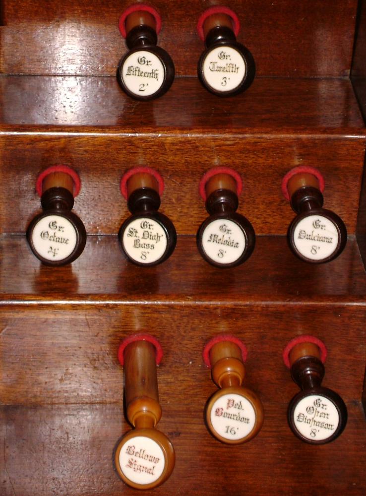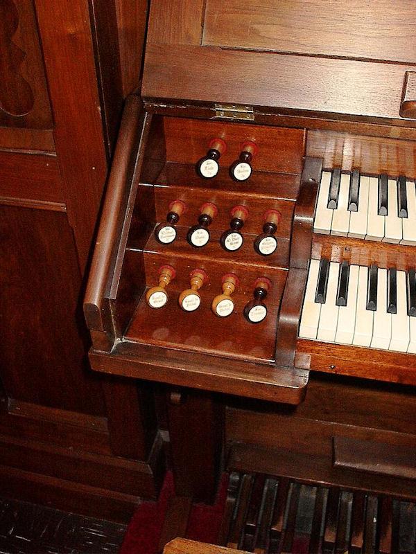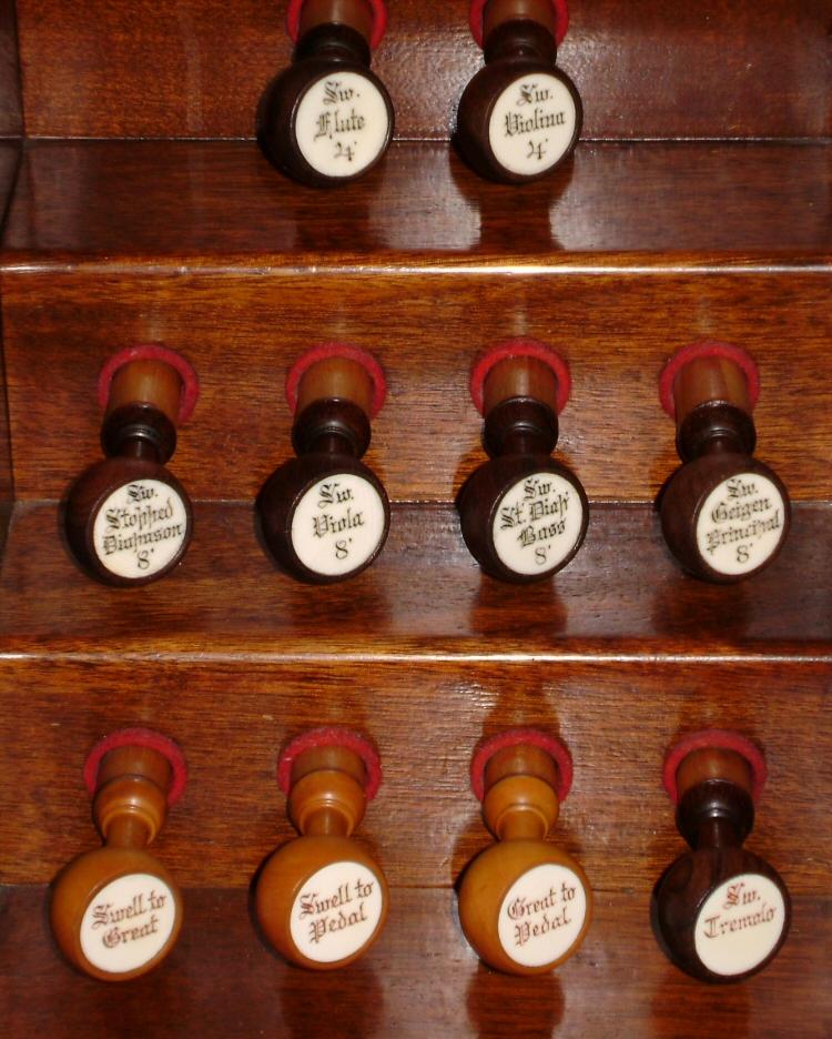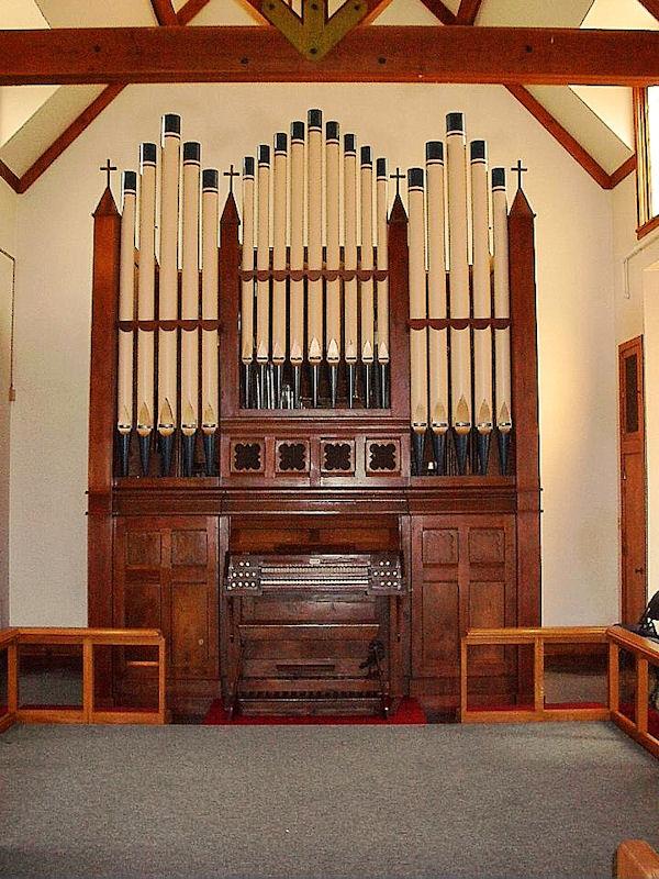 Updated through online information from David P. Dahl. -- Current stop list: same as original except the following changes: Swell Violina 4 (so still labeled) is a Casavant spotted metal Dulciana, functioning much as a Fugara 4. The former Violina 4 pipes are now the Great Dulciana 8 (from tc), in that the scale is identical (and the original Dulciana pipes were damaged beyond usage. The original facade pipes of the Open Diapason had been cut and mitered for use at Hillcrest Presbyterian Church. These were replaced and re-stenciled (by PLU organ students), built for the organ by Organ Supply Corp, and installed in 1990. The organ has had restoration procedures accomplished over a period of 20 years through the efforts of Richard Bond, Martin Pasi, Paul Fritts and Tim Drewes. Bond retabled the chests and releathered the double rise bellow and feeder bellows. Pipe repair, regulation and action repairs were done by the other builders listed. In 2001 a PLU student Jacob Nelson (with the help of Paul Fritts) restored the hand pumped mechanism. The instrument currently is in excellent condition, and will be featured on the 2008 OHS national convention in Seattle/Tacoma.