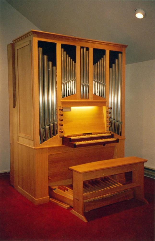 Identified through online information from James R. Stettner. -- The organ is free-standing and encased at the front of the room on the right side. The rift red oak case is 5-sectional containing 25 pipes of the Man. I 4' Principal arranged: 4-7-3-7-4. Manual II is a tenor C division of 44 notes. The organ was dedicated by David P. Dahl on October 8, 1995. The organ cost only $37,000 new. At present (December, 2005) the organ is for sale and will be replaced by an electronic.