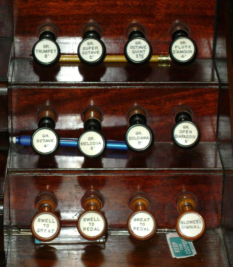 Updated through online information from Tim Drewes. -- Restoration and major repairs by Tim Drewes and Eric McLeod, 2008. Original 2' Super Octave restored at that time. Original Trumpet lost, replaced by Stinkens Trumpet from the church's former R. Byard Fritts organ. Heard at the 2008 OHS Convention.