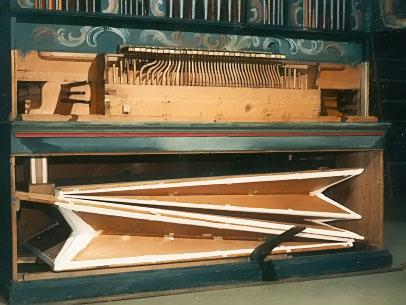 1796? Builder of L?ppfertswell, St. Gall, Switzerland. No pedals. Purchased 1990. Assembled and regulated here by English builder, Edward Bennett.