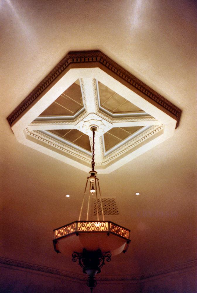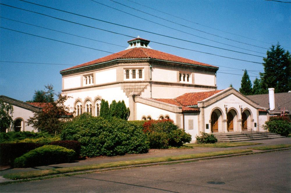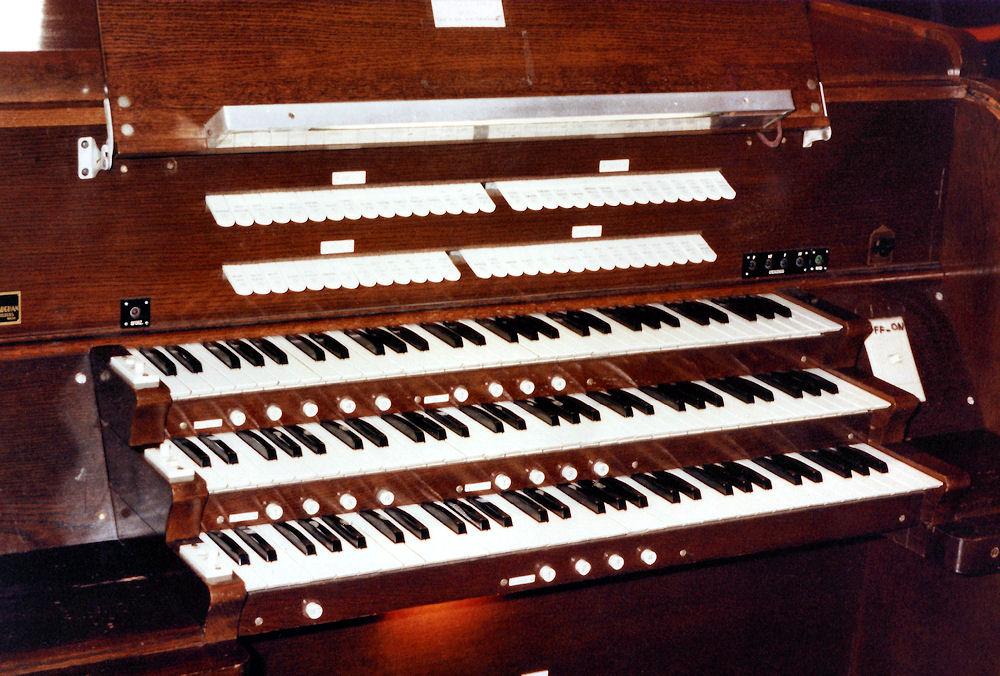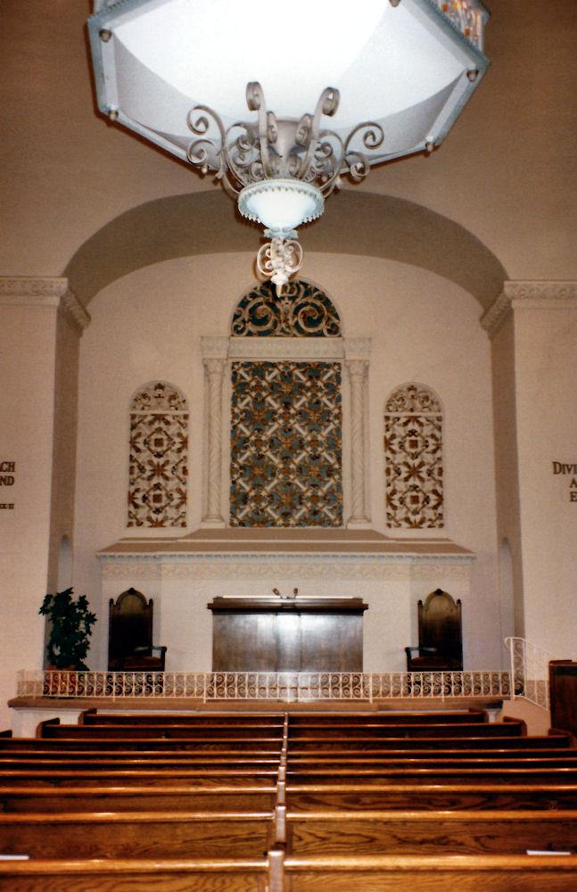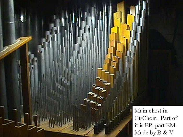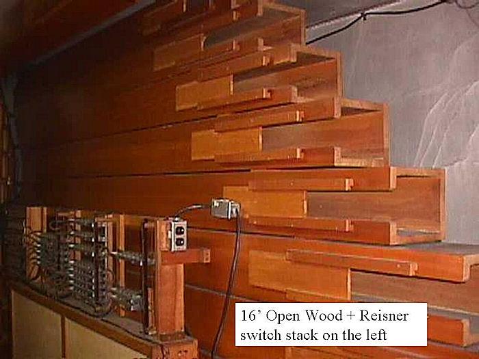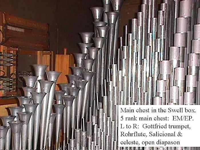 Identified through online information from James R. Stettner. -- The organ is very oddly installed. The Great and Choir are in a basement chamber together, and speak up through a grate in he ceiling to a chamber space covered by an ornamental metal grille at the center of the church behind the Reader's platform. The Swell is in a chamber above the ceiling, and speaks out into a small octagonal space which is above a large, grille-covered opening in the center of the ceiling. The Swell and Gt/Ch are NEVER in tune with one another! The original comb. action was replaced with a new solid state system by Marceau & Associates of Portland, Oregon. At present (10/2006) the building has been sold and is scheduled to be razed and replaced. The disposition of the organ is being decided.