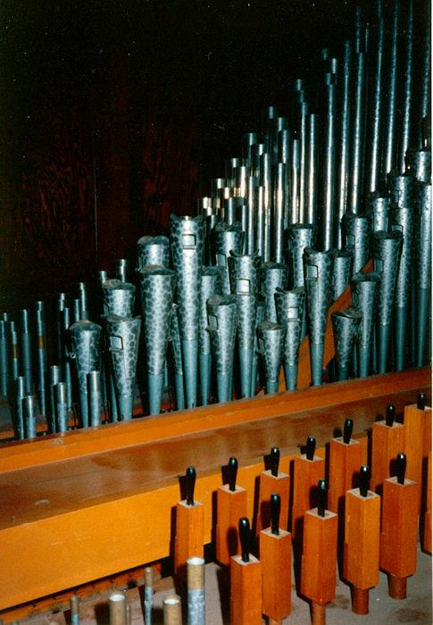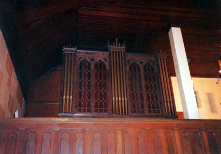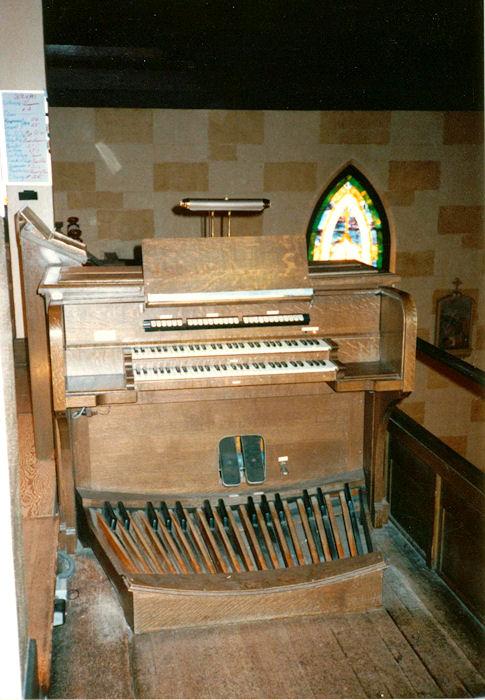 Identified through online information from James R. Stettner. -- The organ was free-standing and encased in the left corner of the rear gallery. The facade was mostly lattice-work with a few dummy gold pipes. The console sat directly in front of the case with the organist facing across the gallery - altar to the right. The organ had 4 ranks much like an "Artiste": Diapason, Stopped Flute, Salicional, and Trumpet. But it was a custom organ with Inter- and intra-manual couplers, and fewer actual speaking stops than a 4-rank "Artiste." The organ was in rough shape when visited 3/20/91. Top g 32 of the pedalboard was missing. And the church was already fund-raising to replace the pipe organ with an electronic substitute.