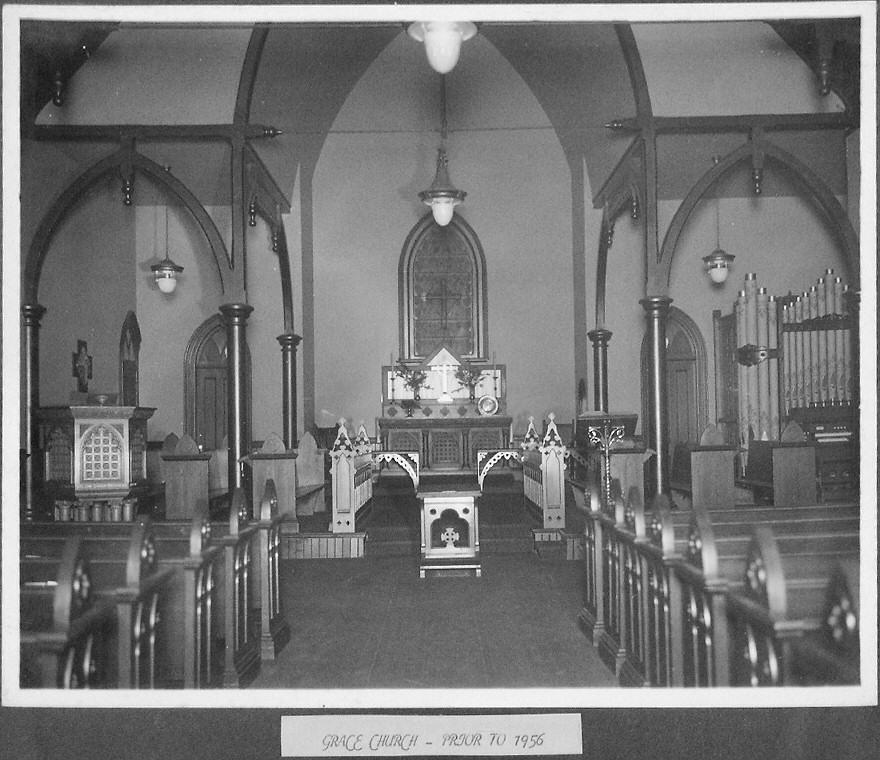 Identified through on-line information from James R. Stettner. -- The organ was free-standing and encased at the front of the room on the right side. The 3-sectional facade contained 23 stencilled and gold-leafed pipes arranged: 5-13-5. The drawknobs were in beveled jambs and had oblique faces. Drawknob couplers were over the Swell keys. The organ remained hand-pumped until an electric blower was added ca. 1932.