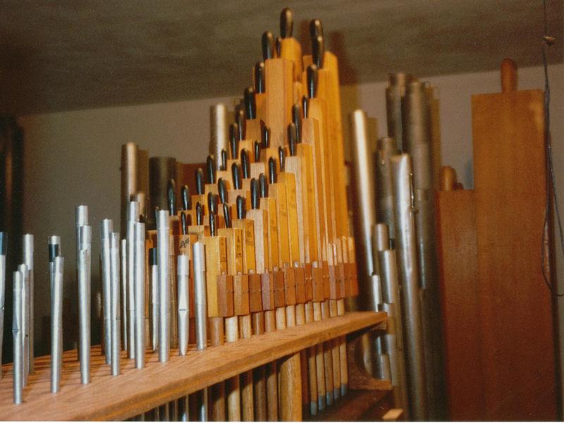 Identified through online information from James R. Stettner. -- This was a project of tonal substitutions to the existing 1929 Estey. A new, homemade, electro-mechanical unit chest was added to the Swell by Mr. Curryer. The "new" stop was called 2' Fifteenth, but the pipes are not entirely principal in tone and are a mix of six different makes of used pipes. The first 37 pipes are three different makes of stopped woods labeled, "St Diap", "Fl Am", and "Gr 293". Notes 38 thru 44 are two different ranks of open metal principal pipes labeled "Octave" and "Fifteenth." Notes 45 thru 61 are marked "Piccolo" and are harmonic. The original 8' Aeoline stop was replaced by this added register, and the Aeoline stop wire was used to turn-on the Reisner gang switch. The Aeoline pipes are still present on their original toeboard, but are unused and silent. The console was not releathered, nor were the pedal chests. In 1994, Meadway & Stettner releathered the console coupler pneumatics. At some undocumented time, but likely while the organ was under Mr. Curryer's care, the original Swell 8' Vox Humana was replaced with a used set of Estey labial Oboe pipes of unknown provenance. It was originally a tenor C set, so a used, canistered, Salicional bass was provided from another undocumented source. Tenor C of the labial Oboe is marked, "Oboe/a 513/W. McLaughlin/July 1905." Bass CC of the removed Vox Humana is marked, "943/6" wind/2-14-28/R.C.L." The Vox Humana was donated to St. Ann's R.C. Cathedral in October 1995 to replace their badly damaged original Reuter Vox Humana. Source: extant organ, June 28, 1994 and subsequent visits.