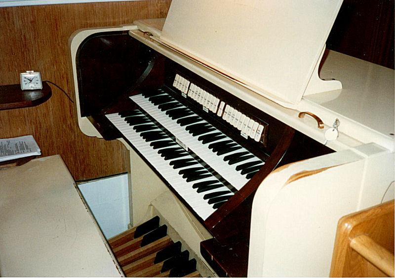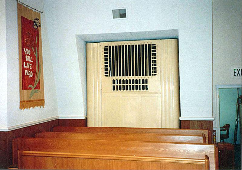 Identified through online information from James R. Stettner. -- This is a self-contained unit organ in an Art Nouveau-style case of mahogany that has sadly been subsequently painted canary yellow. It is located on the right side of the chancel and speaks across the front. The console is opposite, on the left with the organist facing the organ case. The organ was dedicated along with the newly completed building/sanctuary on Easter Sunday, 1942.