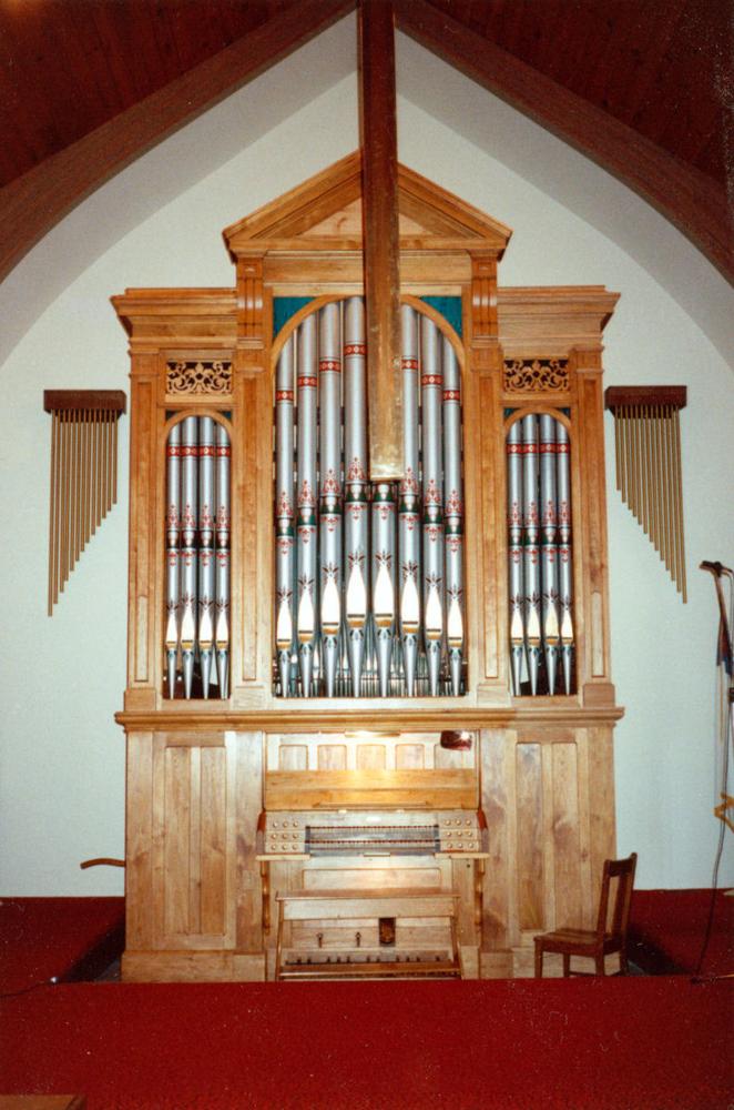 This entry represents the rebuilding and installation of a used instrument. Relocated through the Organ Clearing House from St. Mary's R.C., Shawnee, Ohio which was demolished. Restored ca. 1992 (altered) by Herbert & Marianne Huestis of Ladner, British Columbia and Scot Huntington of Stoning, Connecticut with volunteers from the church. 2' Flautino from another Koehnken & Grimm added to Swell.