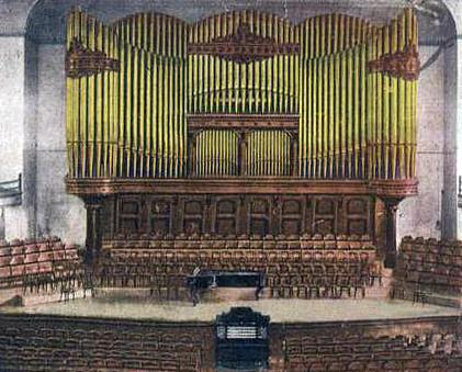 Identified through on-line information from James R. Stettner. -- A postcard image of this organ shows an immense case on the platform at the front of the room. The facade clearly contains 16' Open Diapason pipes. The console is pictured on the main floor in the photo. I don't think this was the Municipal Auditorium as the exterior of that building looks somewhat Art Nouveau. The case looks like it could be Skinner (but it's not), or maybe Hutchings-Votey (like Woolsey Hall) or the Los Angeles Art Organ Co. (like the 1914 St. Louis World's Fair organ).