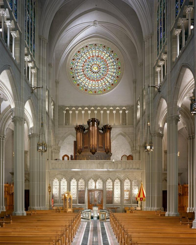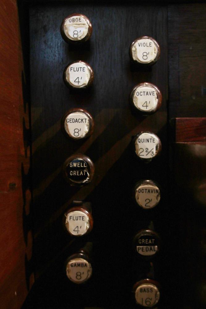 Visited 6/30/22 and recorded. Organ is in usable condition but deserves thoughtful historical restoration. As part of the move from St. Joseph's c. 1970, the pedal was electrified due to space constraints. Pedal ranks are now on stand-alone chests scattered around the balcony. Manual-to-pedal coupler remains mechanical. Drawknob face plates were crudely replaced c. 1970, and it seems some stop names were altered from the original German during this time. Pedal ranks use original drawknobs connected to toggle switches. An earlier stoplist mentioned 8' Oboe as "unavailable," but pipes are present and usable. Same stoplist mentioned an IV Mixtur which now appears on drawknob as a III Cymbale; unknown whether composition of mixture changed at same time.