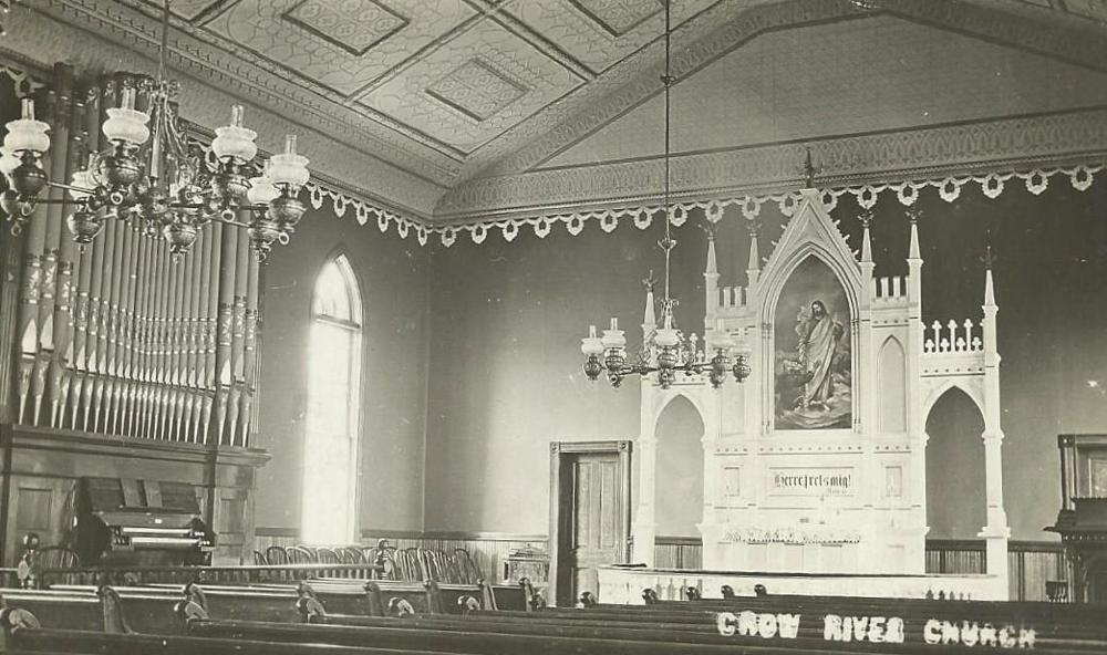 A vintage postcard shows a 2-manual organ standing at the left side of the "nave." The lower case work is simple frame and pane. There are decorated facade pipes arranged in three flats. There is no upper casework.