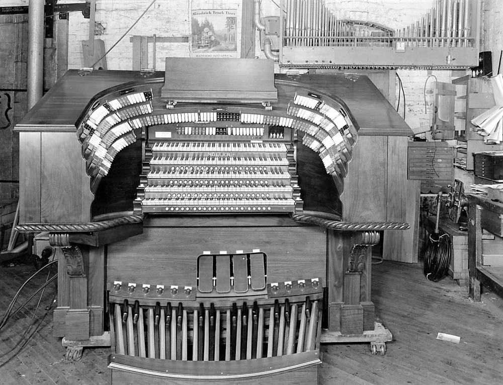 Built in 1938 as touring organ for Reginald Foort of Great Britain. Organ was sold to the BBC, which acquired the former Jubilee Chapel (an unused Methodist church) in Hoxton (north London), for a new broadcasting studio; the organ remained there for almost 30 years. In 1963, the organ was sold to Dutch Radio Hilversum, largely at the behest of organist Cor Steyn, and installed in a church ("Tesselschadekerk") in Hilversum, The Netherlands. Cor Steyn died soon after the organ went on the air; due to a lack of suitable players, the organ remained silent for most of its time in Holland. In 1973, Peter Möller Daniels of M.P. Möller, inspected the organ for a prospective buyer, Preston M. (Sandy) Fleet, who wanted it for his Organ Power Pizza #2 restaurant in Pacific Beach, California. The organ was shipped to the Möller factory where it was refurbished. Several alterations were made: the Doppel Flute was replaced with a Brass Saxophone, while the original Saxophone was replaced by a French Horn; the Post Horn was extended down to 16' pitch, and the rebuilt console was refinished in white and gold. After installation in the restaurant, the organ was dedicated by Reginald Foort in November 1975. By 1979 the organ was for sale again. When the organ became available, Gordon Belt and J.B. Nethercutt purchased the organ and donated it to the city of Pasadena for installation in the Civic Auditorium. Dave Junchen and Steve Adams installed the organ over a period of nine months, spending much time re-regulating its pipes and tremulants toward a more theatre organ sound. Tom Hazelton played the dedication concert on April 23, 1980; Reginald Foort was in attendance, and was moved to tears.