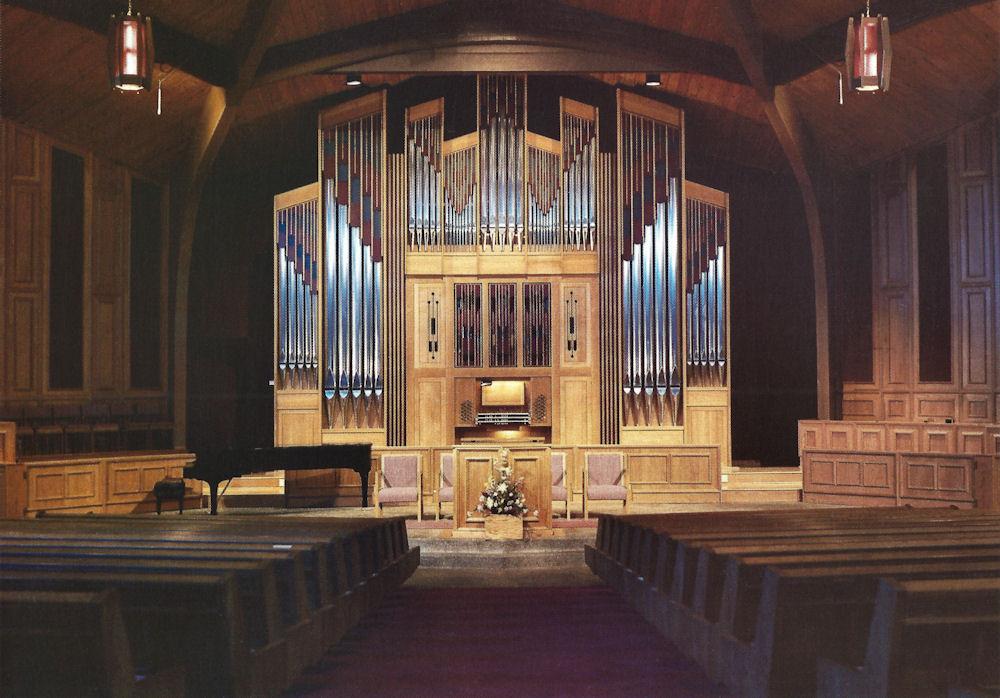 Updated through online information from James R. Stettner. -- 9-sectional French oak case containing 53 pipes arranged: 5-5-5-9-5-9-5-5-5. Keys of bone and ebony. Organ ordered Feb. 1985. Delivered March 29, 1988. Final cost approx. $280,000.00. Dedicated by church organist Dr. Melvin West on June 25, 1988.