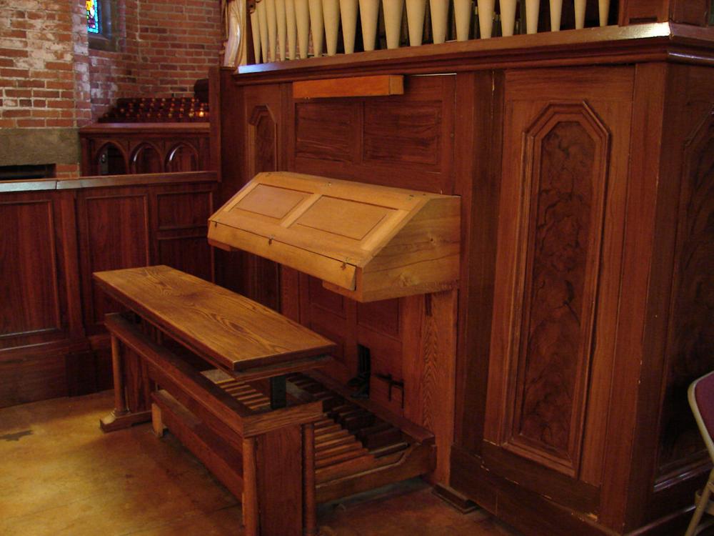 Updated through online information from James R. Stettner. -- Since the Seattle OHS convention, the sanctuary interior has been restored to its original design. The organ was literally shrink-wrapped in plastic to protect it from dust during the construction process, and has since been put back into use. Last I saw it in October of 2011 - only the pointed finials atop the case had yet to be reinstated. The Pedal 8- Bass Flute is made from 1926 Estey open wood pipes (opus 2517) from First Congregational Church in Sacramento, California.