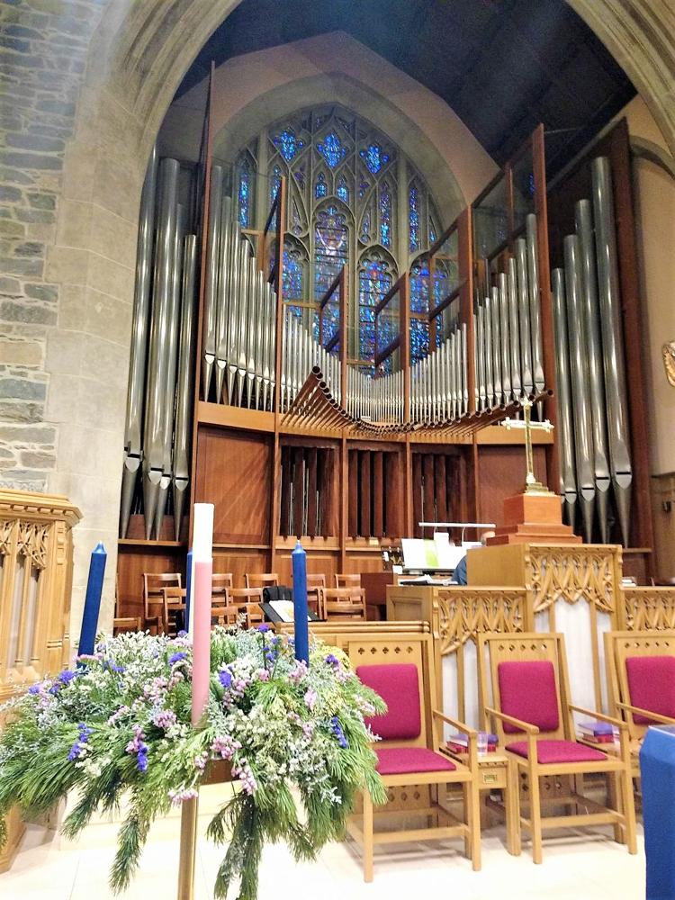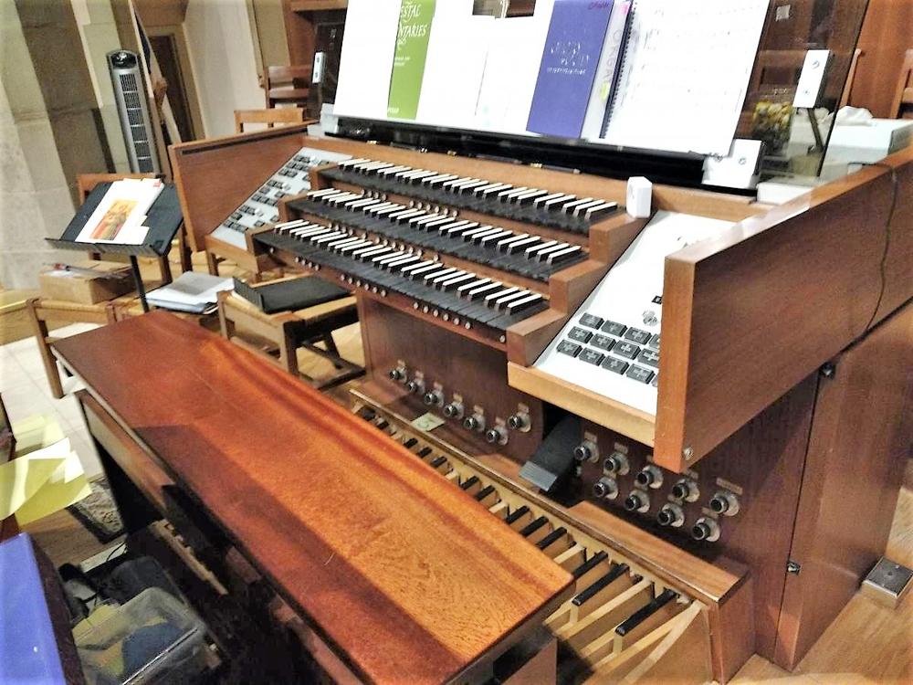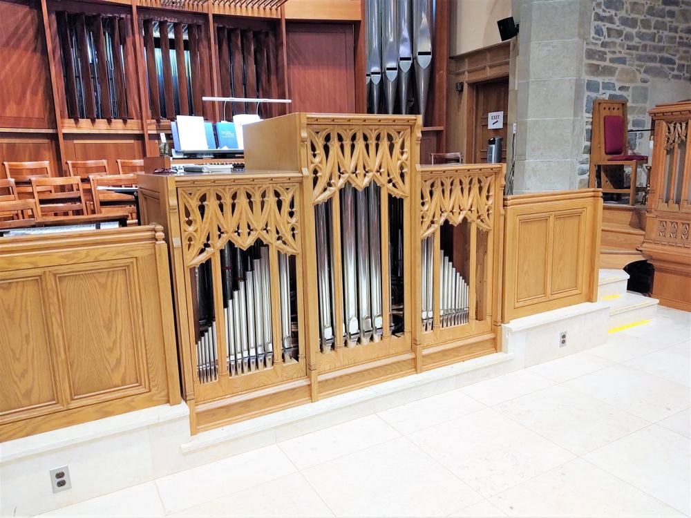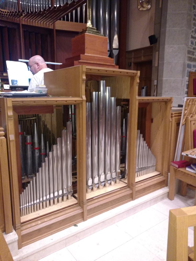 At the time the organ was renovated, the chancel and sanctuary were modernized. The original positive case, mimicing the style of the main case, was thought to be out of place. A new gothic style case was built matching the chancel furnishings. The original positive chest and pipes remain unchanged except for the facade, 4' principal. A new principal was made to fit the case. The original glass swell shades, which flashed reflected light when moved, were replaced with mahogany shades made for this installation. It was requested the pedal 4'Musette be replaced with a louder more commanding stop. A 4'schalmei was installed. The schalmei and mahogany for the shades came from the Rieger that was destroyed by fire at St. James' Episcopal, Richmond, VA. The schalmei was part of the former Swell Trompette. Three digital 32' stops were installed as part of this project. Three new illuminated push button switches were added to control them. Optical switches were used for key action so electric contacts never touch the trackers. Worn out parts of the key action were replaced, schwimmers and static regulators were recovered. Two large decorative case panels were also replaced with simpler designed mahogany panels. The glass panels are supported by thin framework of the case. Once a year the tops of the glass panels must by cleaned, a harrowing job. The organ continues in good condition and is part of a vital music program at this church.