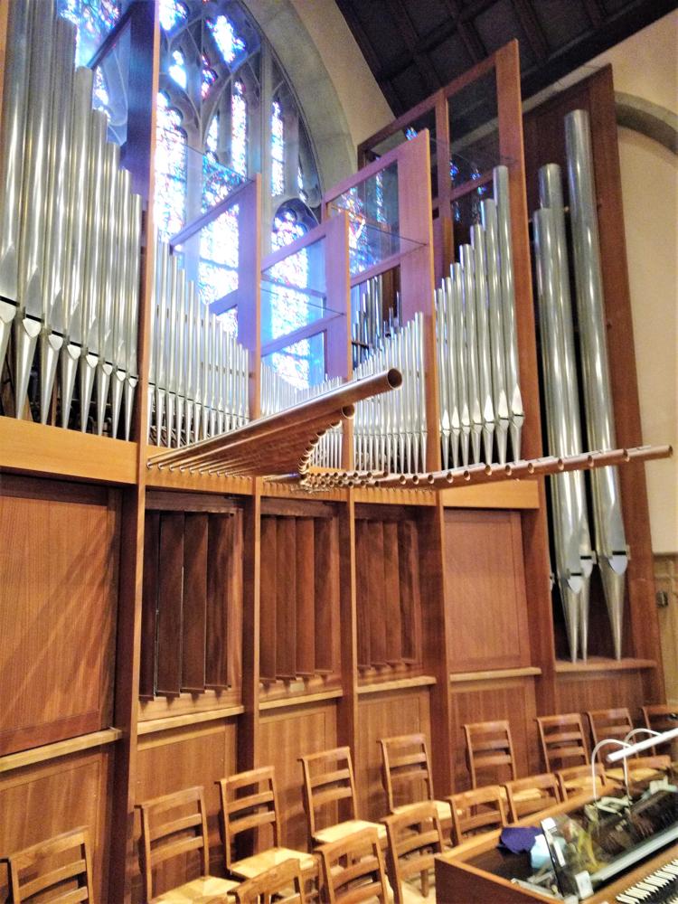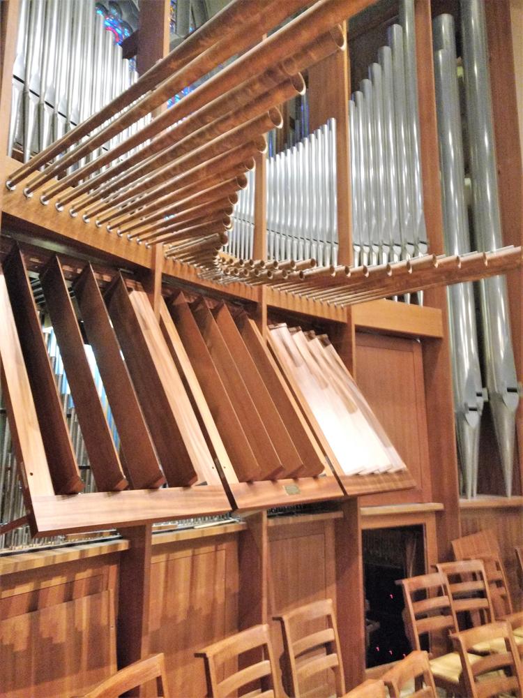 Updated through online information from Tom Scheck. -- The case of this organ is made of glass to maintain an unobstructed view of the stained glass window behind the organ. Modifications by David M. Storey, Inc. of Baltimore, Maryland, to the original installation by the builder (Rieger Orgelbau). The original glass Swell shades were replaced by wooden shades. The Rückpositiv division was reconfigured and provided with a new case and new façade pipes. The Pedal 4' Musette was replaced by a more suitable 4' reed stop. Also, three electronic 32' stops were added to the Pedal.