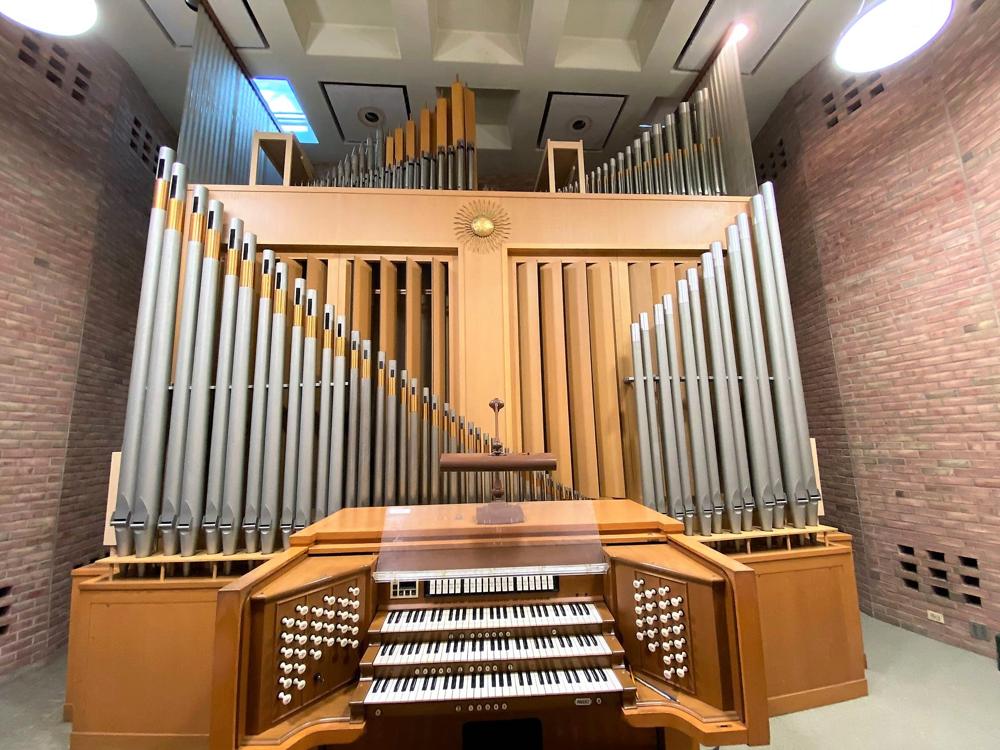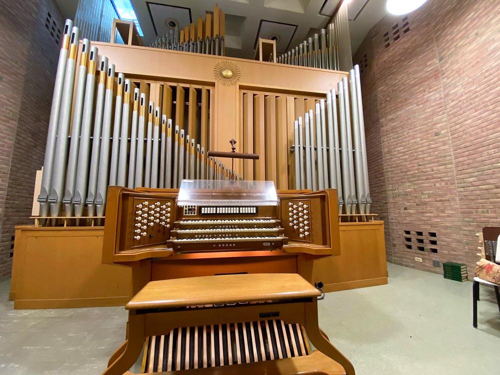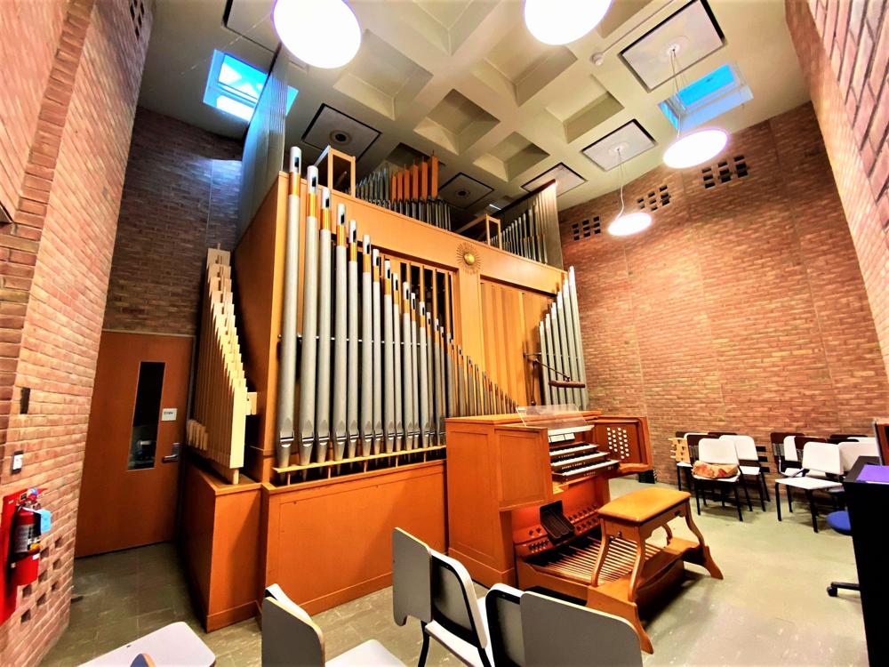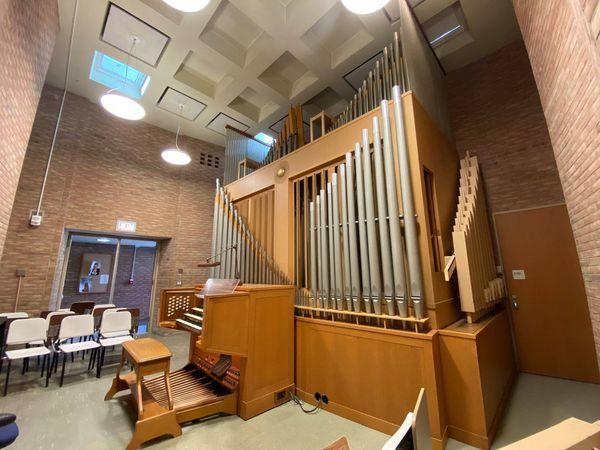 Updated through on-line information from Charles Kennedy. -- The console was renovated in 1995 with the installation of a 256-memory level Solid State Logic combination action. Several stops (marked with an asterisk) were added, taken from existing pipework on unit chests, and more couplers (both intermanual and intramanual) were added to increase the organ's flexibility. At some point after the organ's original installation (within a year or so), a 32' Cornet was added to the Pedal, derived from the Swell 16' Spizflöte, using the pitches 10-2/3', 6-2/5', 4-4/7' and 3-5/9'. At some point later, the 3-5/9' was removed from the wiring, so that it is now 10-2/3', 6-2/5', and 4-4/7'. These pitches carry through the entire pedal compass. The original Positiv 8' Gedeckt was removed, and substituted for it was the original 4' Koppelflöte with an 8' wooden bass from an unknown source. In place of the Positiv 4' Koppelflöte was substituted a stopped metal rank, believed to have come from one of the earlier studio instruments (either by Kuhn or Rieger) which existed in the old music facilities on central campus, and which were later sold or dispersed. At some point, a Zimbelstern was added, controlled by a revsersible toe stud. [Corrections to specifications as printed in the database: The Positiv Sifflöte 1' is a 12-pipe extension of the 2' Blockflöte, and is not independent. The Pedal 8' and 4' Gedeckt are both extended from the 16' Subbass and are not derived from the Positiv Gedeckt.]