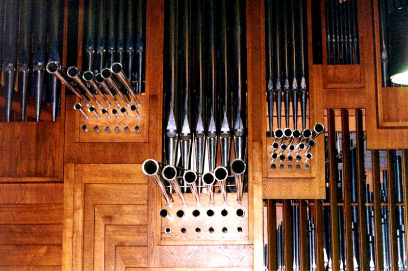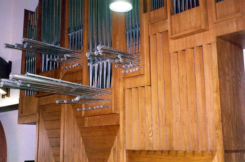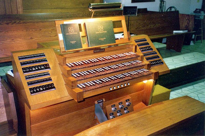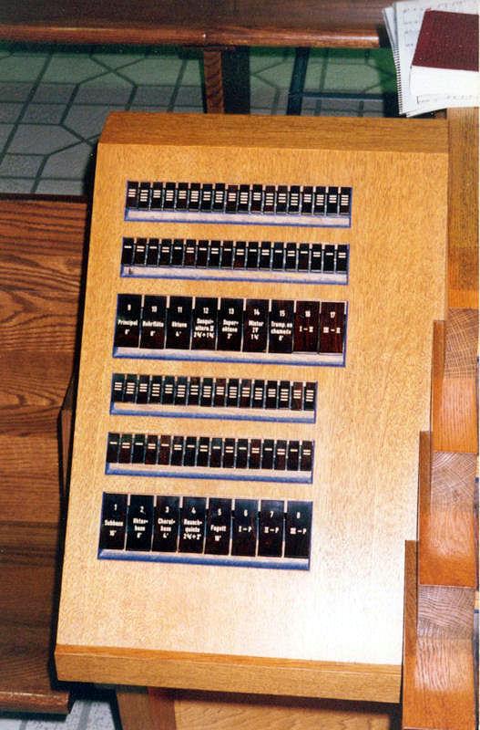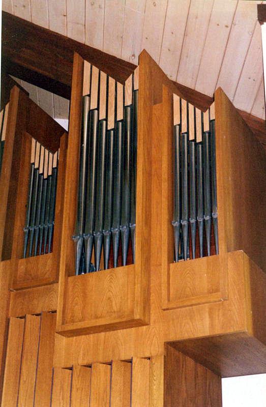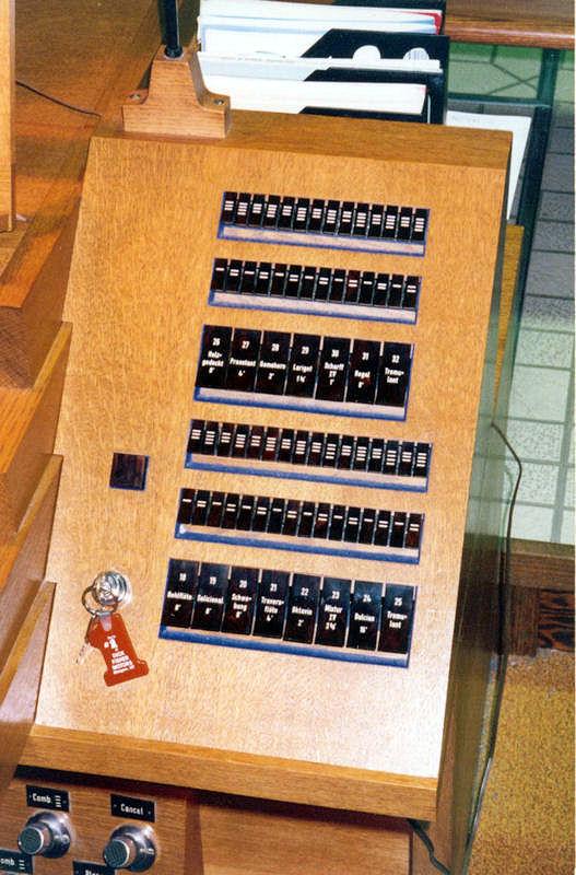 Updated through on-line information from James R. Stetther. -- A gift of a wealthy parishioner. Keydesk detached with organist still facing case - back to the altar. Asymmetrical case with Pedal at the far left, Hauptwerk in the center, Positiv on the right at the top, and Schwellwerk on the right beneath the Positiv. This organ replaced a small, II-manual, 4-rank M. P. Möller damaged in a church fire.