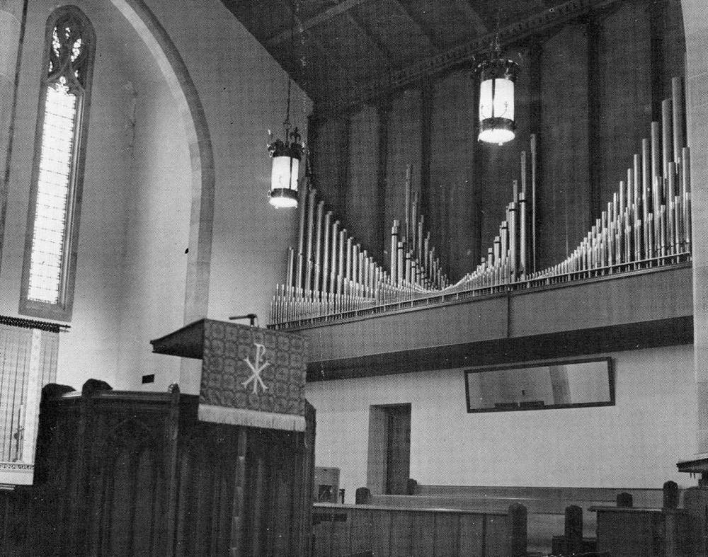 Updated through online information from Terry Eason. -- The organ was originally contracted as a four manual organ, including exposed Positiv and enclosed Choir with roll top console. Several months afterwards, contract was revised to merge the Positiv and Choir into an enclosed Positiv and the console was changed to a three manual without a rolltop, which is how it was installed in April 1975. The stoplist shown is exactly correct as the organ was originally installed. The 1998 additions were exactly as shown as prepared for, except that the Festival Trumpet was not enclosed with the Positiv, but placed near the Great Trompete. The 32' Basson was installed as a digital stop, and not real pipes, along with the additional digital 32's that were not originally prepared for.