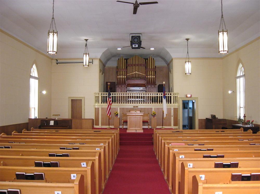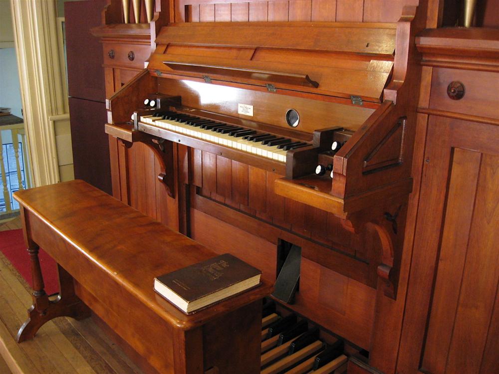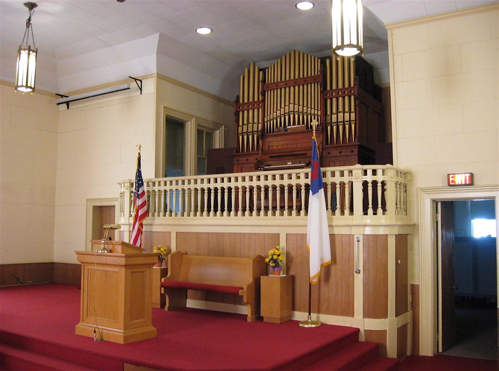 The organ is used occasionally during worship services. All the stops play on both the manual and pedal at the same time. The gold color of the pipes is not original. According to one of the church members, older photographs show that there was originally stenciling on the pipes.