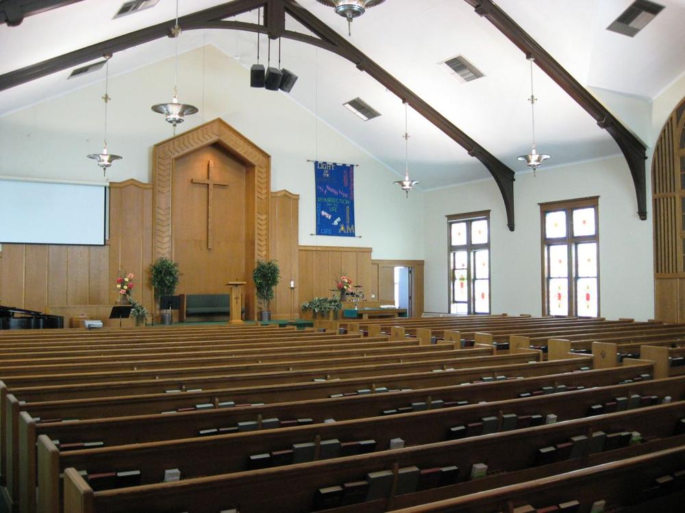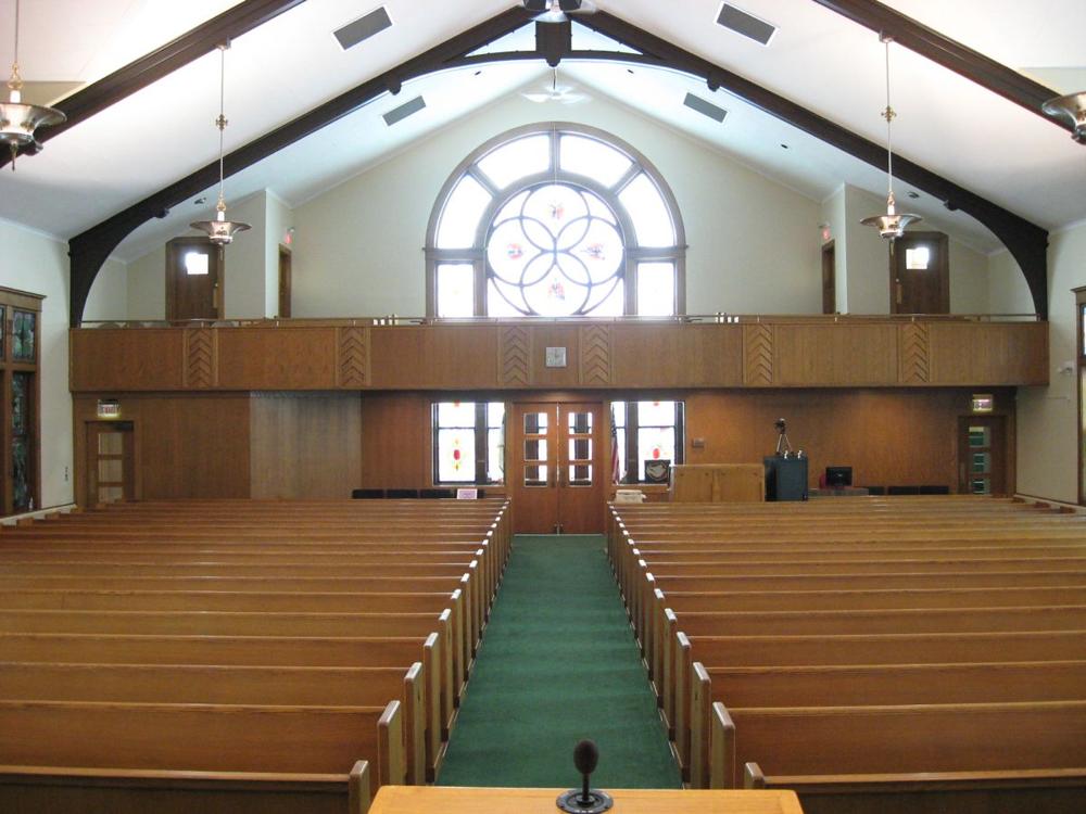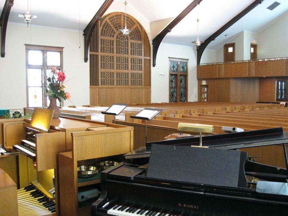 Identified through on-line information from Chad Boorsma -- This instrument began as a tracker instrument built by the Hillgreen, Lane and Company in 1909. Repairs and improvements to the organ, including a new detached console, were completed in 1948 and likely included painting the facade pipes white. The organ chamber is located on the east side of the sanctuary. Prior to a 1962 remodeling of the sanctuary, the pews faced that direction in a semi-circular fashion with the pulpit in front of the organ chamber. It was during this remodeling that the pipes were covered by grillework. In 1974, the organ was given all new windchests (electro-pneumatic), a new Klann console, and tonal changes by Don Swem. Some of the original facades pipes are still used for the lower notes of the Great 8' Diapason.
