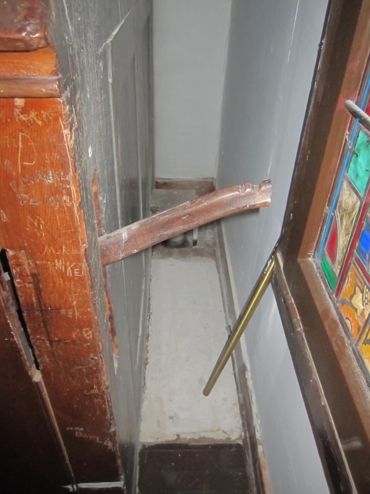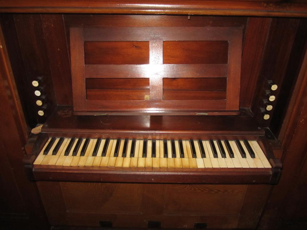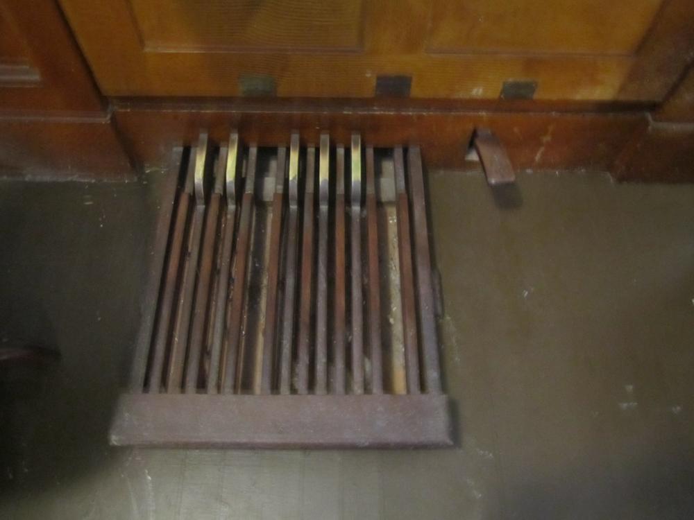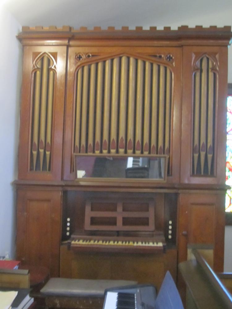 The horizontal shades open not quite half-way, and the rear of the case has been removed to allow greater tonal egress, but has unfortunately been lost. The reservoir is weighted with field stones. The pump handle protrudes from the right rear of the case, and was shortened by probably at least half so the organ can sit close to the wall after it was moved to the front. The facade of half-round wooden dummies may have originally been gilded, but the present treatment is either paint or an antique gold toner glaze, and the upper lips (but not the lower) are painted a dark maroon.