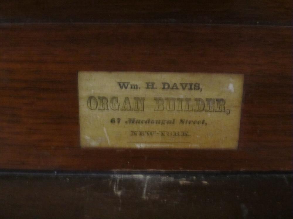 I examined the organ June 28, 2021. Other than the addition of a 1/6 h.p. Spencer Junior electric blower, (3" static pressure), the organ is in original and unaltered condition. The blower is installed in a metal box placed in a well to the side of the organ, accessed by lifting a hinged section of the floor-- there being no cellar under this portion of the building. The instrument is very well built from quality materials, including mahogany chest table and sliders. The pipework is beautifully crafted of substantial common metal, and the wood pipes are sealed with brick paint throughout. The faux-grained oak finish on pine is well executed by an experienced hand. The voicing is sweet yet fulsome . As of 2021, the double-rise reservoir and single-wedge feeder are still operating on original leather- remarkable. The church was built in 1801 with a three-sided gallery and barrel-vault ceiling. If it weren't for the carpet covering every square inch, the church would have excellent acoustics. At some point in the 20th century, the interior of the upper case was lined with thin sheets of homosote acoustical material.
