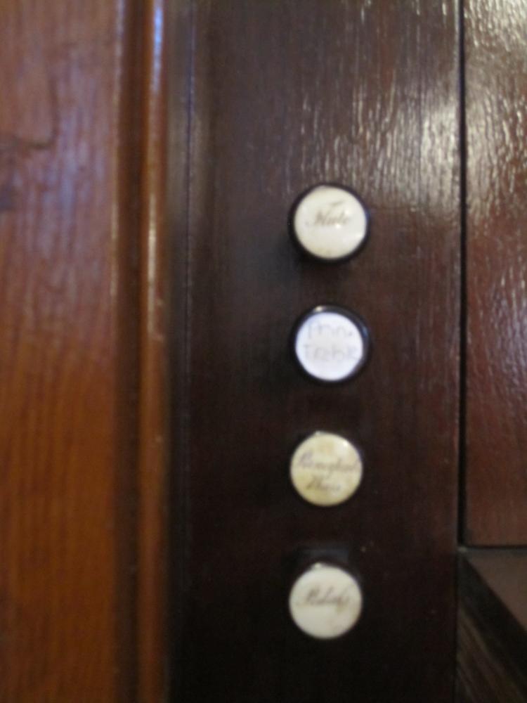 The stops all divided a tenor-f, with only the Principal and Stop'd bass being full compass. The wood trebles have bored stoppers, and screwed-on walnut caps. The metal ranks have no skiving, and the cutups are ever so slightly arched. The nicking is vertical and moderately light. The metal pipes overblow normally by mouth, i.e. voiced on the quick side. The stop'd bass is strong with a prominent twelfth. The only zinc pipes in the organ are notes 1-5 of the 4' Principal. The octave of pedals is original, and is engaged with a stop knob. The hitchdown pedal has a short travel and a single hitch at full open. The metal pipes are carefully cut to pitch with little evidence of tuning-- small tabs on the larger pipes, minimal coning of the small pipes, currently with random and mild pinching adjustments. The pitch is low: 436.4 at 83 degrees, which would be roughly 430 at 70.