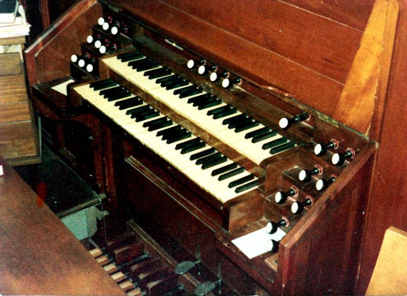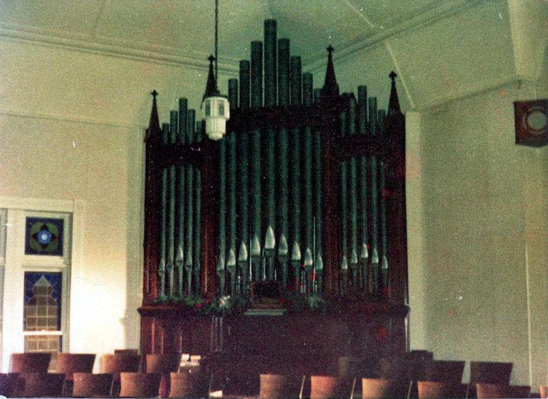 Updated through on-line information from Michael A. Way. -- A typical "Akron Plan" church. Which placed the organ in a corner shaped case at the right-hand corner of the room relative to the diagonal center aisle leading from the main entry to the chancel/altar area. I played this organ several times but failed to write down the specs. The instrument still had its complete hand-winding mechanism but a blower was routinely used.