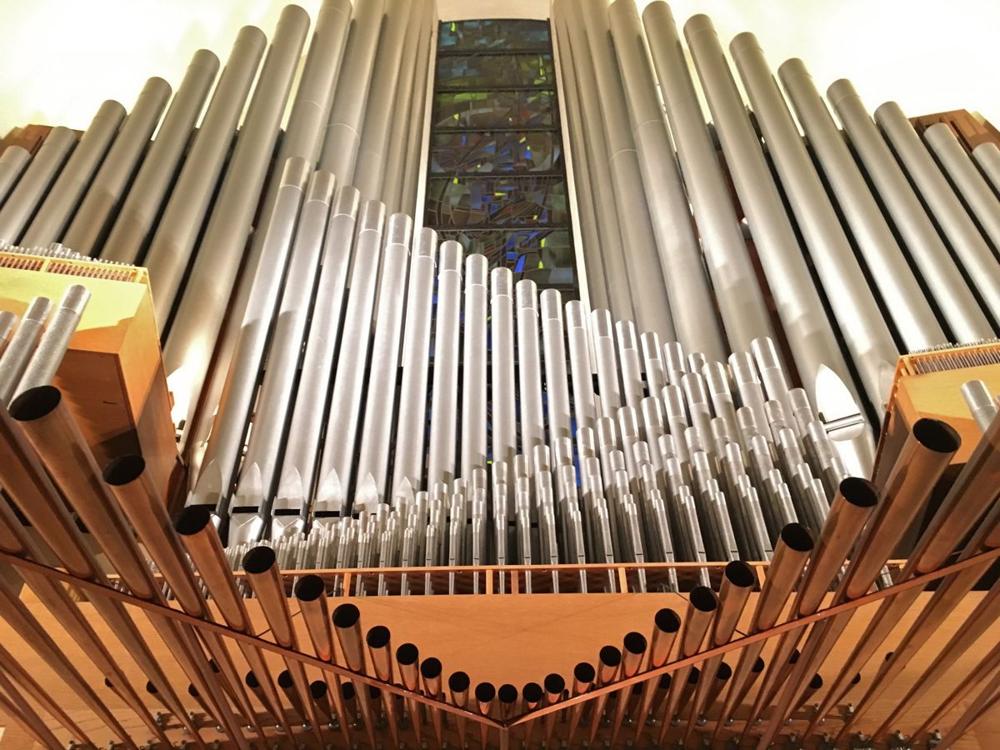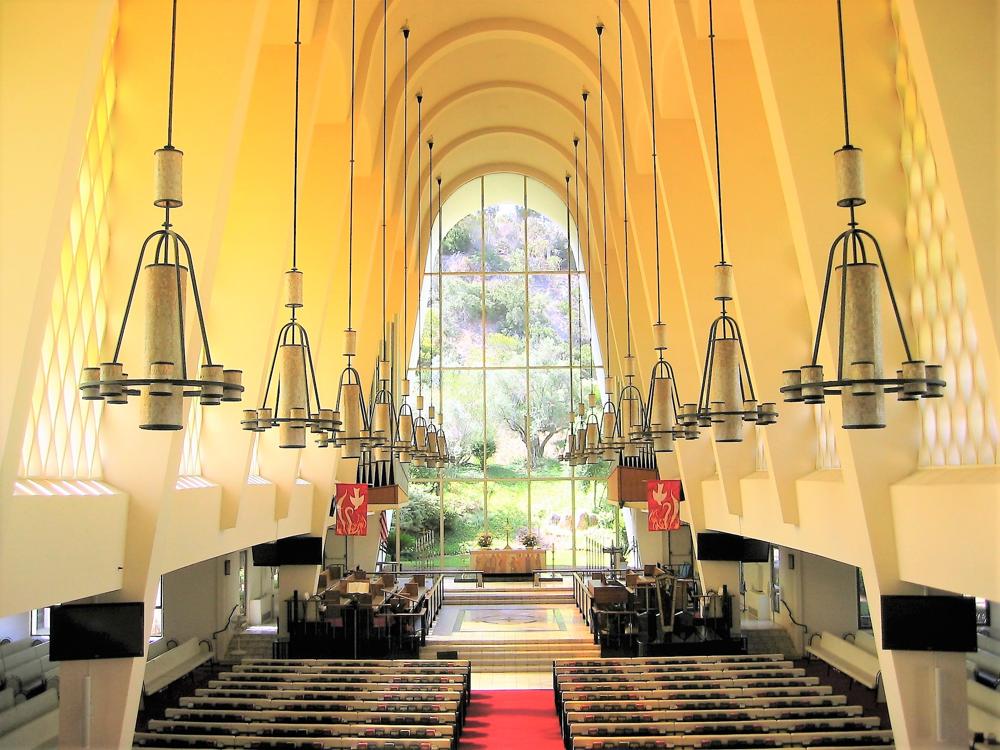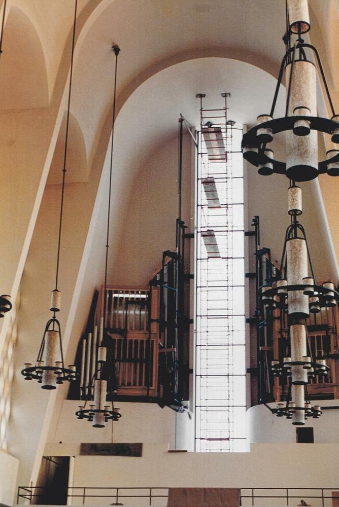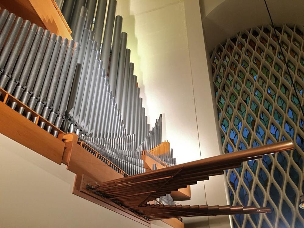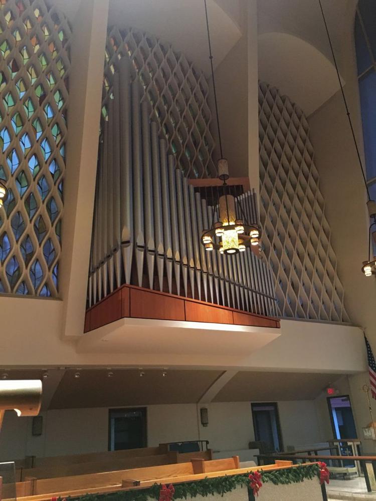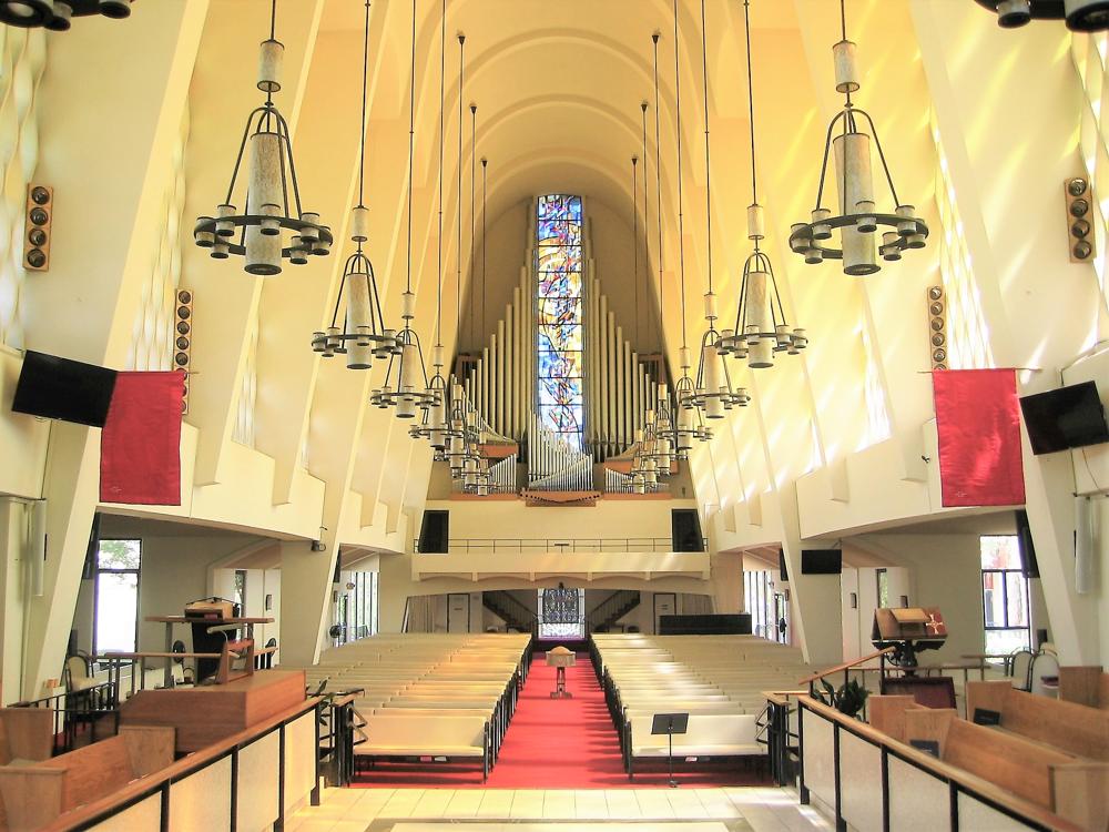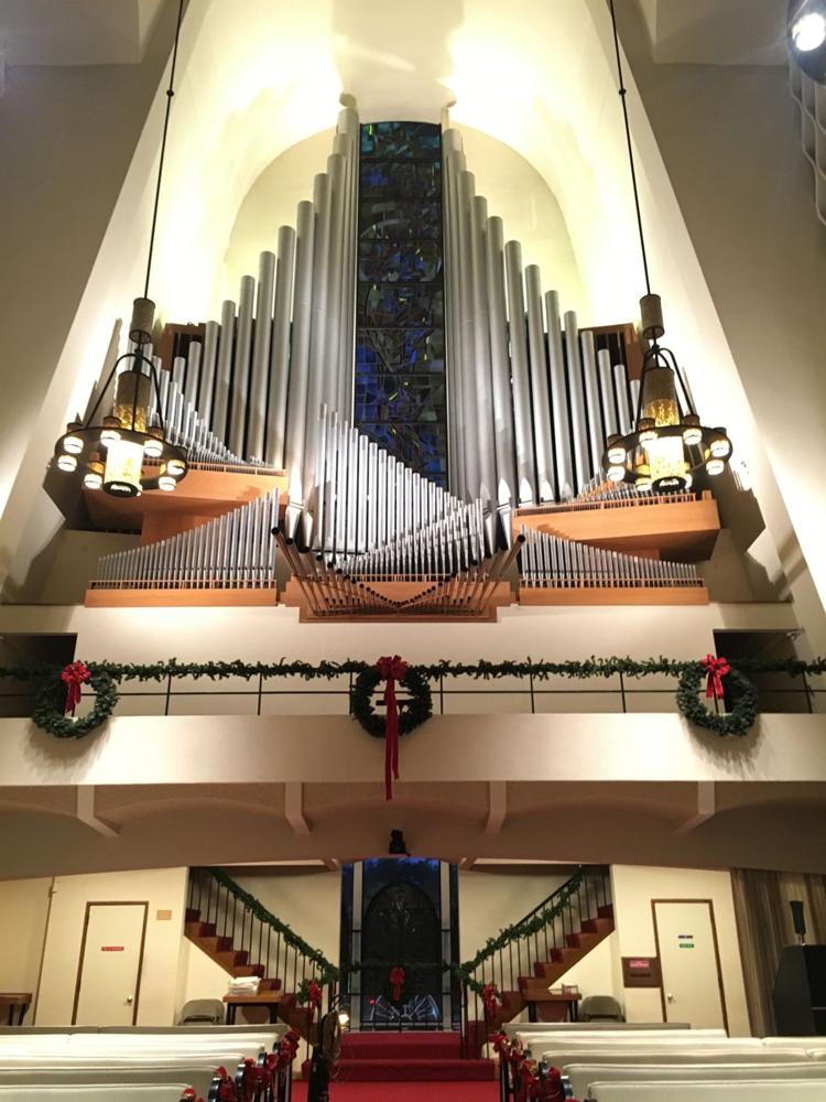 Updated through online information from Jeff Scofield. -- When the congregation moved to Mission Valley in 1964, 1929 3/28 Pilcher Op. 1453 was stored until 1971, at which time it was rebuilt and enlarged to 41 ranks by L. W. Blackinton & Associates and installed in the rear gallery of the new sanctuary; Blackinton had installed a 12-rank Chancel organ in 1967; in 1986, Blackinton removed the organs and rebuilt and enlarged them to 107 ranks, with 28 ranks in the Chancel and 80 ranks in the Gallery, including a Festival Trumpet donated by Blackinton in memory of his parents in 2010.