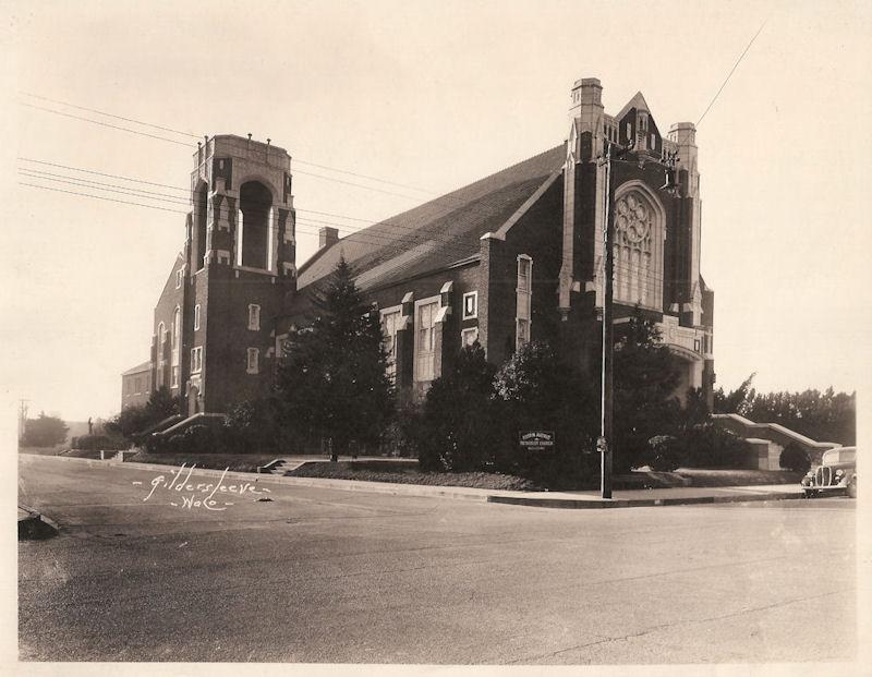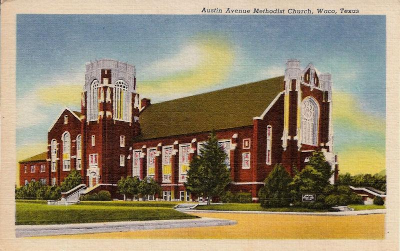 Updated through on-line information from T. Bradford Willis, DDS. -- The Official Texas Historical Building Marker states: Austin Avenue Methodist Church Designed by R.H. Hunt, this edifice is a substantial interpretation of Gothic architecture. It was built in 1925 during the ministry of the Rev. Cullom H. Booth. The two-story- equivalent brick structure, which rests on a raised basement, features a prominent bell tower. The original tracery detail in the tower was removed by the 1940's. The original art glass windows and tracery detail in the sanctuary were replaced after a 1954 fire caused extensive damage. RECORDED TEXAS HISTORIC LANDMARK - 1990