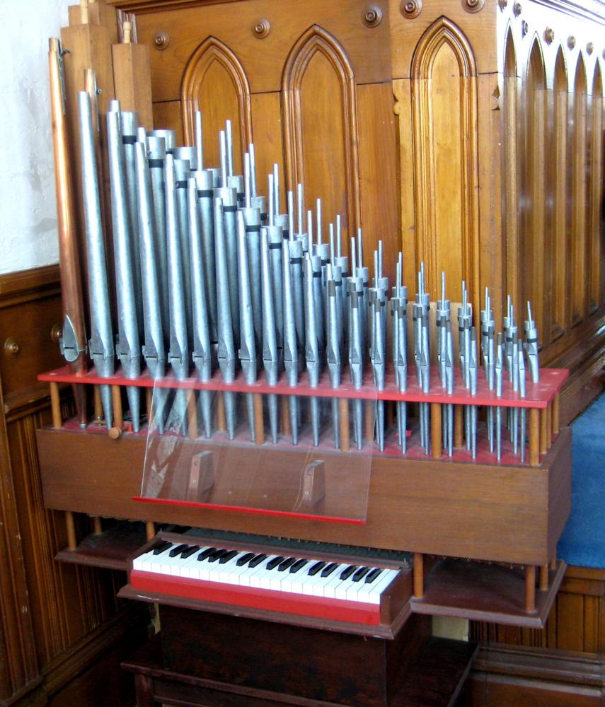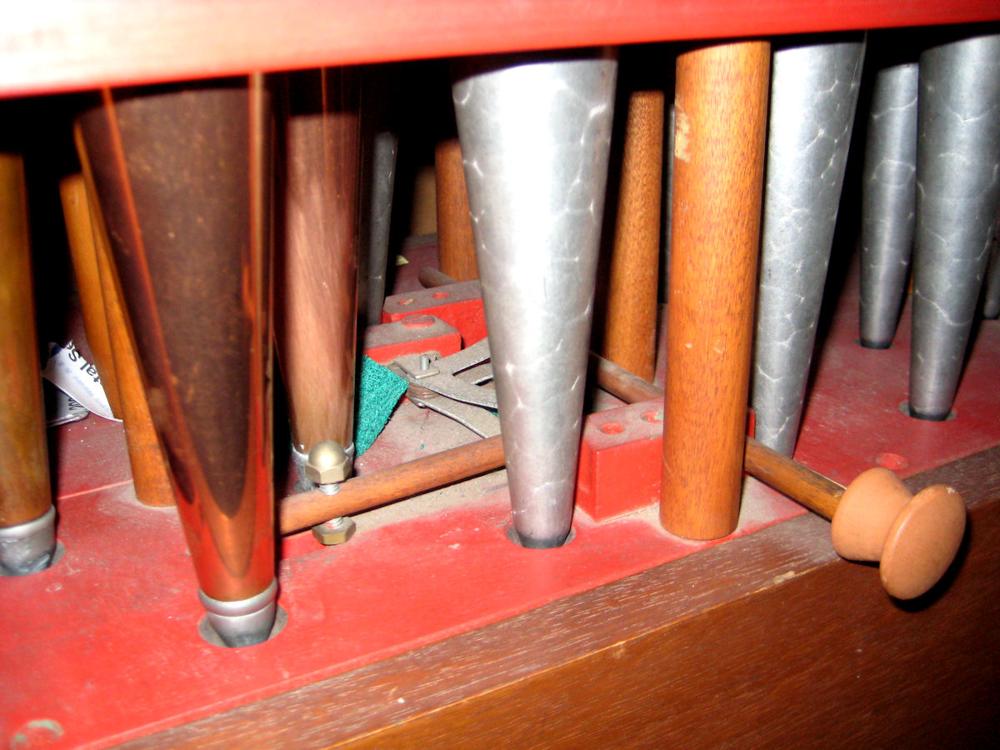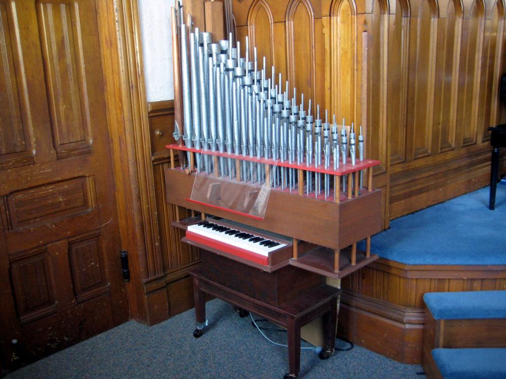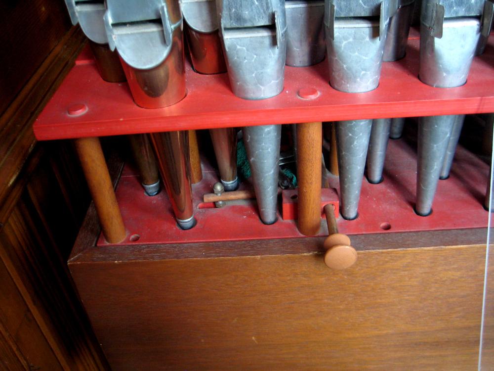 Identified through online information from James R. Stettner. -- This organ was built by the church's former Music Director, Marshall Stone. The two ranks are an 8' Rohr Flute and a 4' Spitz Principal. There is only one drawknob control. The 8' Rohr Flute is always on, and the single drawknob adds the 4' Spitz Principal. Interestingly, the connection from drawknob to slider is made through the top of the toeboard! The Rohr Flute begins as stopped wood, turns to capped metal, and then to a chimney flute. The first 3 pipes of the Spitz Principal are of copper. The pipework looks to be of European manufacture. The manual compass is 40 notes from AA thru c 49. The action consists of the key tails engaging a backfall which then returns the action forward where the other end of the backfall is attached to the chest pull-downs by string.