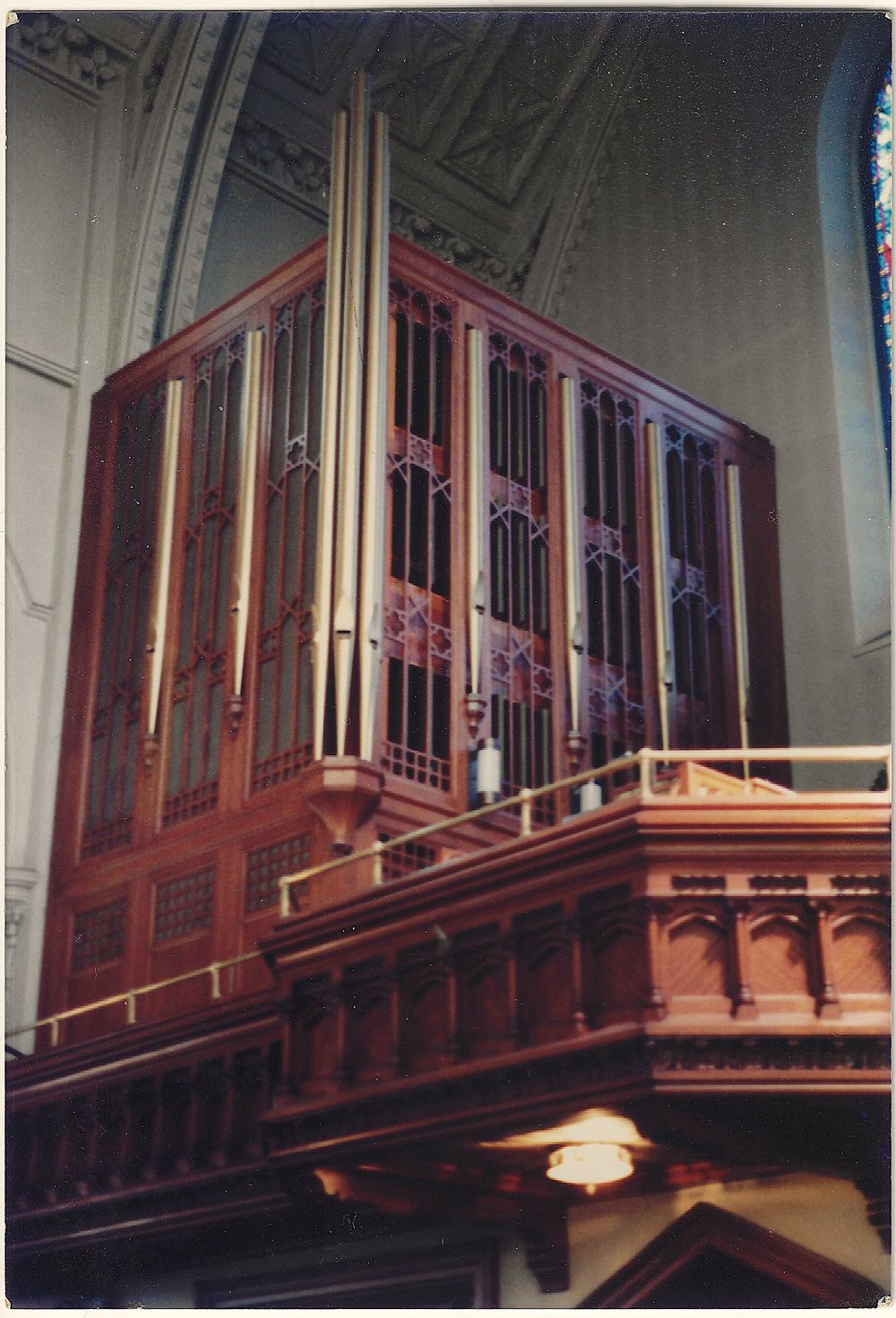 Identified through online information from Jeff Scofield. -- Divided in basic cases to each side of the gallery window; a 3/13 Wicks Op. 4802 was added in 1967 in the sanctuary with a stoptab console that also controlled the gallery organ; both organs were rebuilt and enlarged by Russell & Co. in 2000 as Op. 38, retaining some of the pipework and mechanisms.