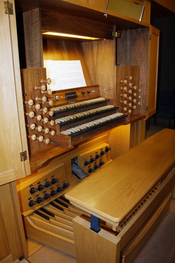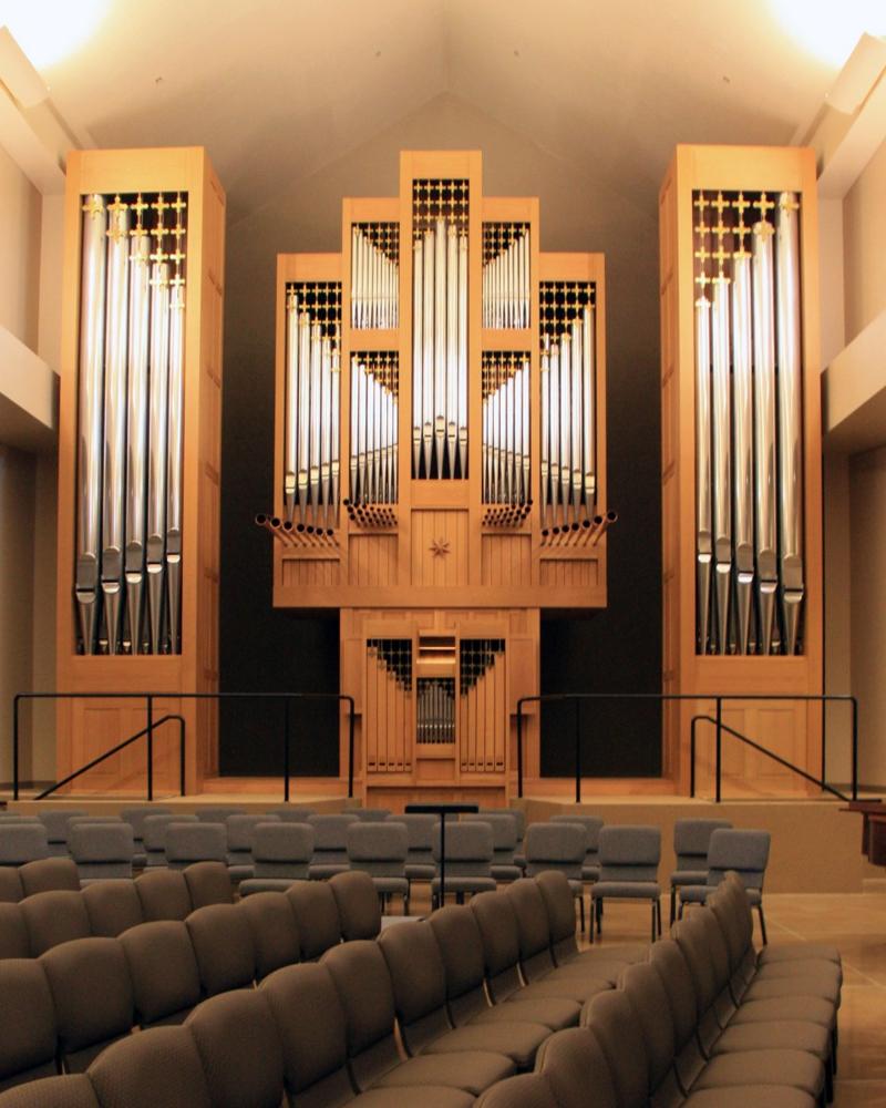 Identified through on-line information from Patrick Ogilvie. -- Housed in a natural color German oak case, maintaining the traditional configuration of a central T-form. The main case houses the Hauptwerk, with the Schwellwerk above and behind it. Two pedal towers stand at either side, and the Riickpositiv is on the main floor behind the console, in the midst of the choir seating, where it is in an excellent location for continuo work. The stop and combination actions are electric, with four memory levels. The Spanish Trumpet is mounted horizontally on the main case with copper resonators, below the case pipes of the 8' Principal, and the rotating star of the Zimbelstern is at the same level. The Cornet V is mounted in the upper facade of the same case, flanking pipes of the Pommer. Facade pipes of the Riickpositiv are From the 8' Holzgedackt, and the Pedal towers display pipes of the 16' Principal. Paul Tepker, director of worship and fine arts, played the dedication service on November 18, 1990. The inaugural recital was played by Edward Murray on January 27, 1991. The organ was disassembled by Werner Bosch and put into storage. It was reassembled in a new chapel and the rededication service was held November 21, 2010.