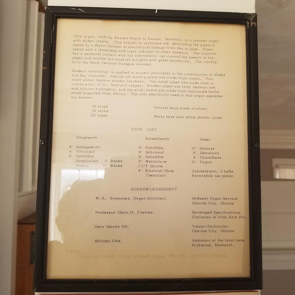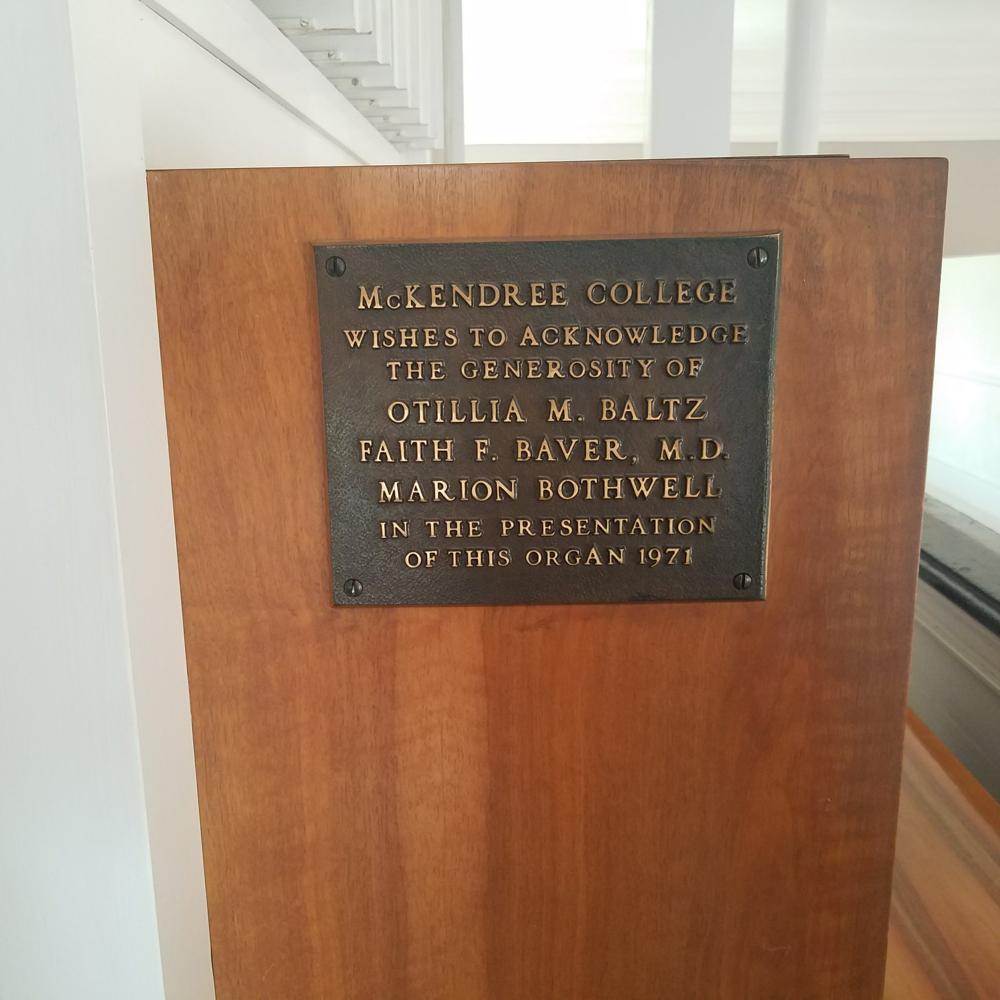 Updated by Mathew Skurat, who has heard or played the organ. Mathew Skurat also named this publication as a source of information: Various McKendree History Books on Campus and historical documents posted near the instrument. Mathew Skurat also listed this individual as a source of information: Dr. Nancy S. Ypma, University Organist.<br> The most recent update to this entry is part of a collaborative research effort by organ student Mathew Skurat and Dr. Nancy S. Ypma, Chair of the Division of Visual and Performing Arts and University Organist at McKendree University in Lebanon, IL.