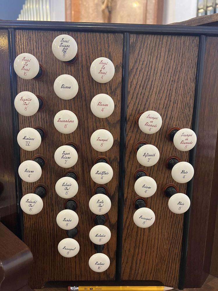 Updated through online information from James P. -- Choir loft contains 3 ranks of pipes- each rank contains 61 pipes. The choir loft's fanfare vertical trumpets includes a large festival trumpet. The largest pipes are the 16' Bourdons located behind the altar.