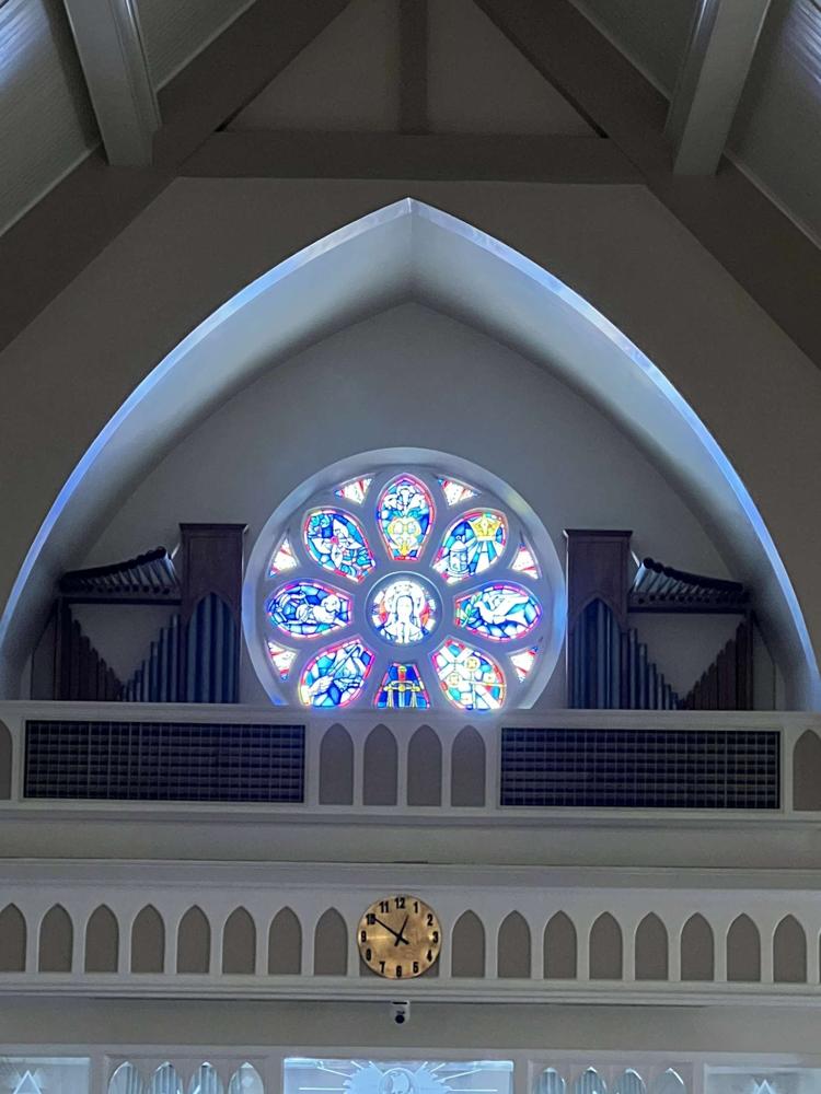 Updated through online information from James P.. -- This organ has 4 divisions disposed over 3 manual keyboards and a pedalboard. The GREAT, SWELL, and PEDAL divisions are located in the front of the church behind the altar, while the ANTIPHONAL division with a set of horizontal fanfare trumpets is located at the rear of the church in the former choir loft. In the front of the church, 32 speaking pipes are visible with a majority of the rest of the pipes located behind them. In the rear of the church, speaking pipes of the ANTIPHONAL divison are visible in wood cases.