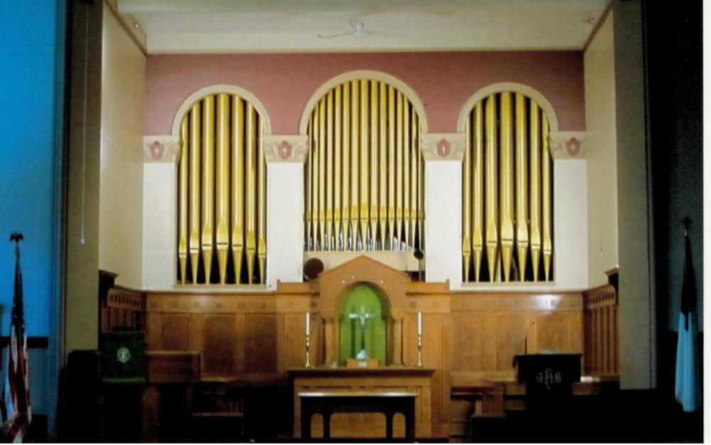 Sometime after WW II the raised speakers platform was removed, and the front of the church was rebuilt as a divided chancel on floor level, but leaving the organ and console now up in the air at their original levels. The console is reached by an unsafe set of narrow stairs, and the modesty reredos prevents the bench from being moved into a comfortable playing position, or the choir and organist from seeing each other. The wood casework was removed and replaced with a false wall, now displaying the original speaking facade pipes in three arches and the dummy pipes were removed. Remnants of the original decoration can still be seen on the back side of the facade pipes.