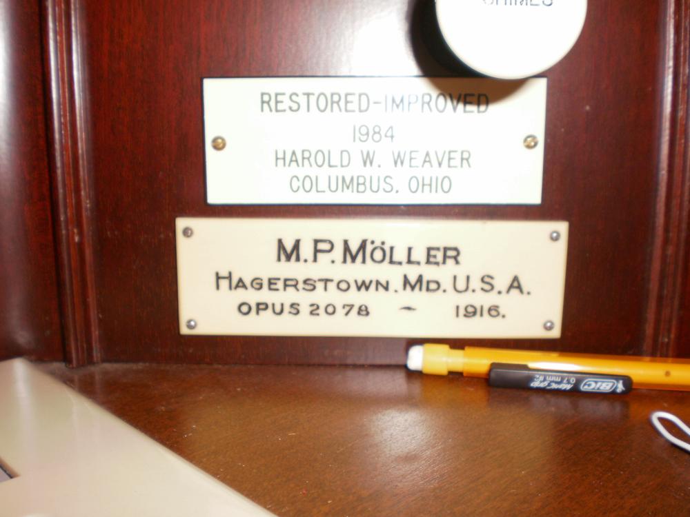 This is a rebuild of an existing organ. Identified by William Dunklin, based on personal knowledge of the organ. -- Installed rebuilt electro-pneumatic chests and a rebuilt detached console. Pipework and case from the 1916 Moller. The builder's plate says "Rebuilt and Improved by Harold Weaver, 1980." Mr. Weaver was one of the partners in A.W. Brandt Company.