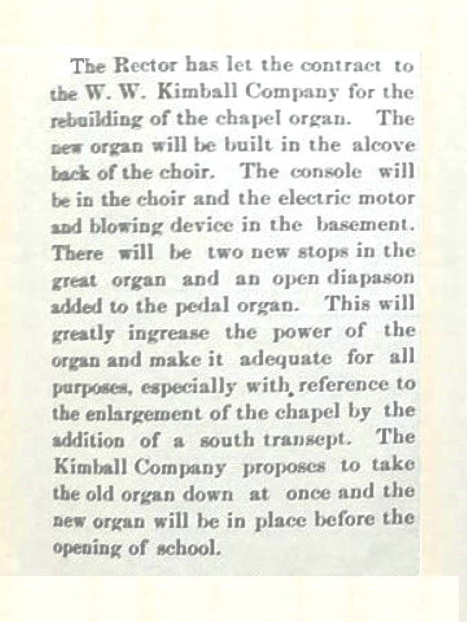 Updated through online information from James Begly. -- A newer reservoir was added in place of the old one. A new console was built to match the old English look of the Chapel and replaced the 1960's looking Organ Supply Console. The console was fitted with all new Peterson Solid State switching, but kept the older pedal board and bench and refinished to match the newer console. the Wind Chest are all original and re-leathered with newer type ventil stop action boxes to replace the older ventil stop actions. The organ originally had a Trumpette 8 that was replaced with a 2' Octave by a previous builder. The octave was moved to an separate D.E. chest to give the tuner more space to crawl into the organ. The pedal Division only consists of a 16 Bordun. The 16' Open Diapason was not done on the rebuild due to too much damage from previous water leaks to the organ. Also a new blower was added to complete this complete rebuild. J.Begly