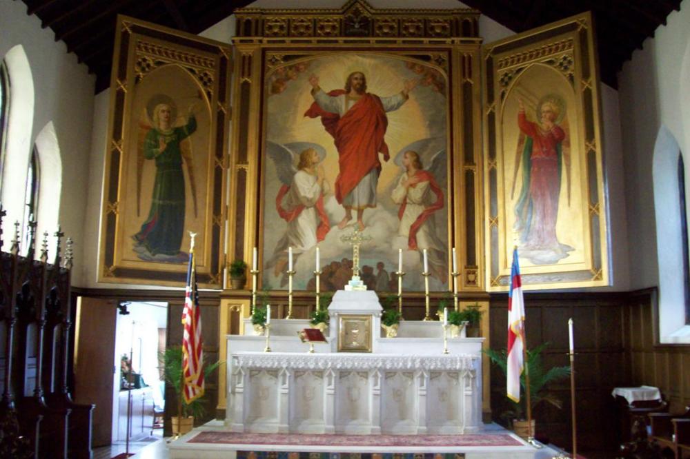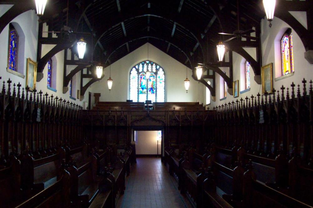 St. James Chapel is on the National Register of Historic Places of the United States. Located on the corner of State Road 9 and Union Street in Howe. Alumni Drive runs directly in front of the building. The Narthex is entered through the bell tower, which contains a clock and chimes. The bells were a gift of James Howe and first played on April 4, 1915. The chimes and clock were the gift of Mr. Percy Dwight, a Trustee. The Nave ceiling is a copy of the ceilings in the Chapel of All Souls and the nave of Magdalen Chapel, both of Oxford, England. The woodwork in the chapel was carved under American supervision by carvers from Oberammergau, Germany. The altar Tryptic was unveiled on March 26, 1910. It was painted on the grounds of the school by Signor Ducci with assistance by Cadet Hugler. The Mother's Chapel in the South Transept was added in 1914. It is dedicated to the Virgin Mary and in memory of mothers of the Howe boys. The carvings in the Mother's Chapel were purchased by Dr. McKenzie during his visit to Oberammergau to witness the Passion Play, in 1910. Artist for the carvings was Anton Lang, who played the part of Christ in the Passion Play. The south side nave stained glass windows depict the founders of the school, while the north nave windows are dedicated to the Bishops of the Diocese of Northern Indiana. The Bishops serve as President of the School's Board of Trustees. Howe Military Academy is sponsored by the Episcopal Church.
