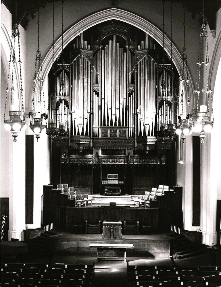 The casework from the 1913 Kimball organ was renovated and a steel structure was created to support the new organ. Eleven and a half ranks from the existing organ were retained (some Kimball, some later additions), including the two large-scale 32' ranks. Most of the reused metal pipes were rebuilt in the Rosales workshop with new languids and cut-ups. The facade was modified and augmented with speaking pipes, the largest of which is 32' GGGG. (Source: American Institute of Organbuilders 2015 Annual Conference program booklet)