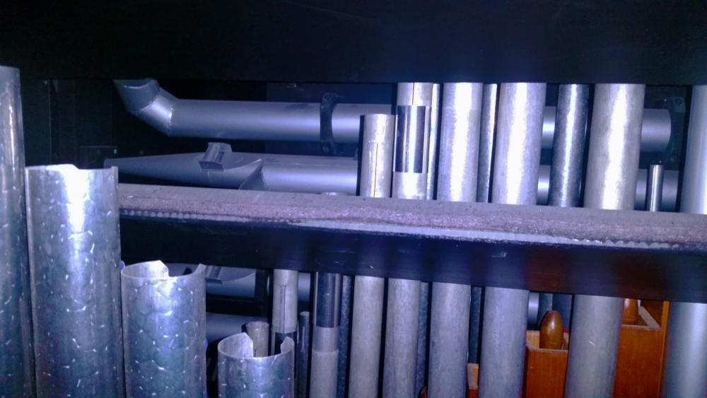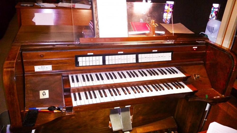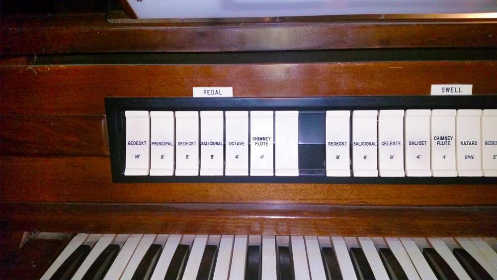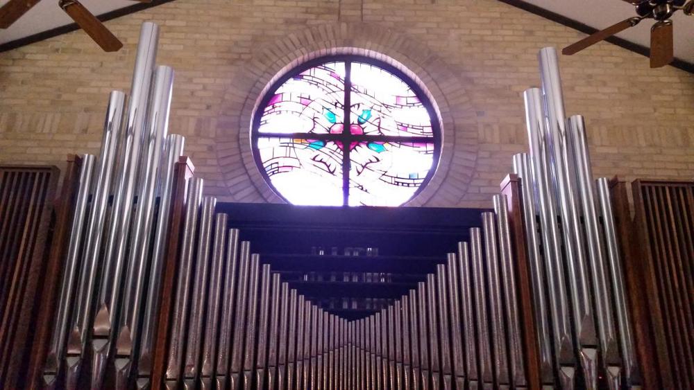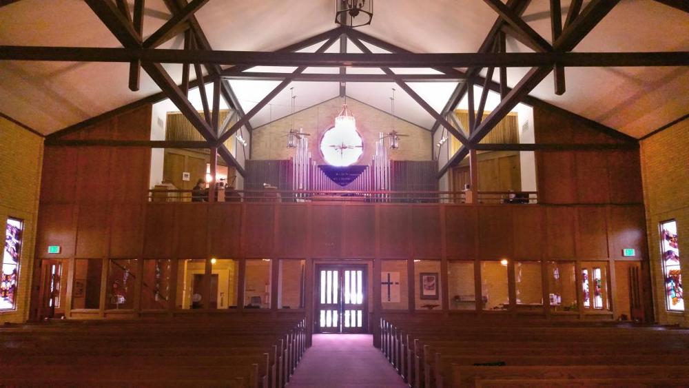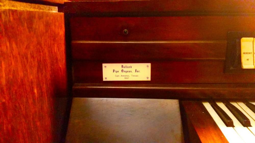 Updated through online information from Julius Coyle. -- After a fire in the church destroyed the previous organ, this organ was installed in 2000 or 2001. The previous home of the organ is unknown (the builder's plate gives 1997 as the installation year) but the mitering of the lowest basses of the Gedeckt rank indicate that this organ either had another home, or the Gedeckt rank was originally intended for a different organ. The lack of couplers, reeds, and mixtures means that the organ is fairly muted "at full cry", but the extensive unification means that a variety of tonal colors can be realized. The organ is located in the center of the gallery enclosed in an expression box, with pipes 1-49 of the 8' Principal rank exposed in the facade. The remaining pipes of the Principal rank is mounted in an offset chest behind the facade, in front of the swell shades. Pipes 1-21 of the 16' Gedeckt rank are located to either side of the expression box, with the lowest notes mitered. Two wooden screens block the Gedeckt pipes from view. The rest of the pipes are located in the expression box. The lowest notes of the 8' Salicional rank are mounted horizontally inside the enclosure. The Chimes are mounted on the left-hand wooden screen.